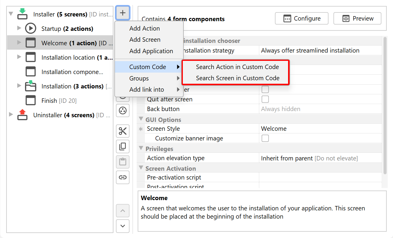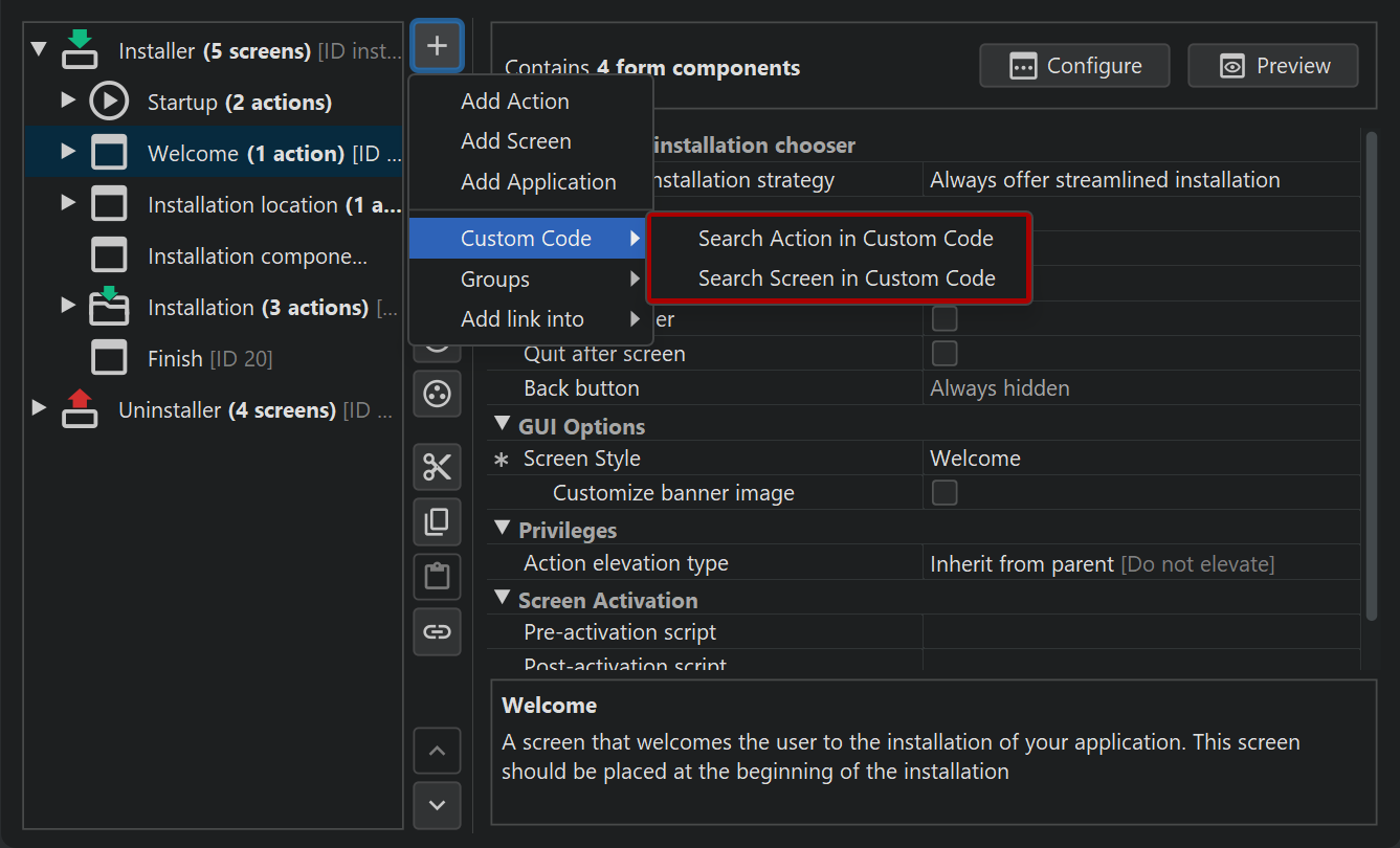 All actions, screens and form components in install4j use this API themselves. To make your custom elements selectable in the install4j IDE, you first have to configure the custom code locations on the "Installer->Screens & Actions->Custom Code" step. When you add an action, screen or form component, the first popup gives you the choice on whether to add a standard element or search for suitable elements in your custom code.