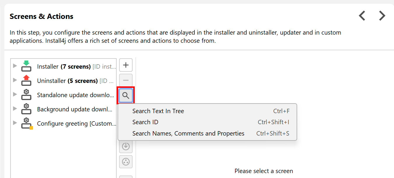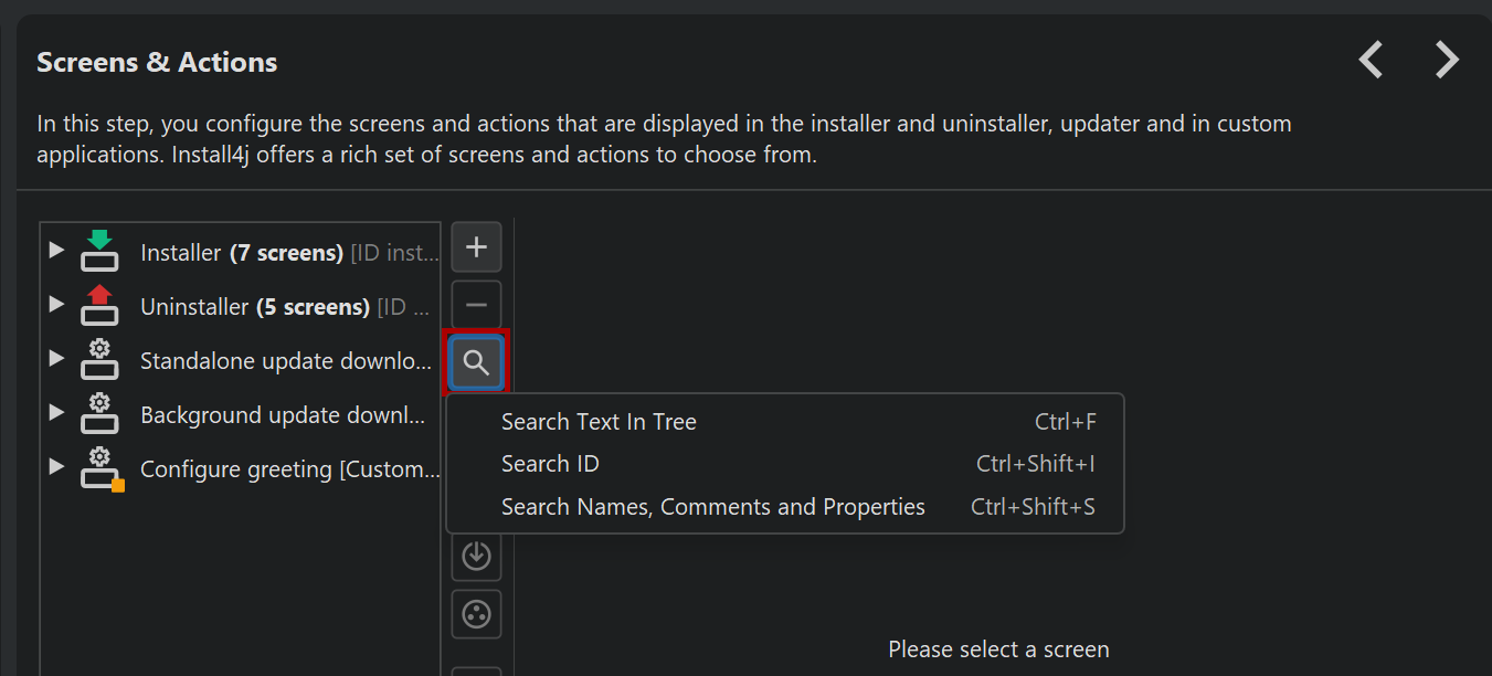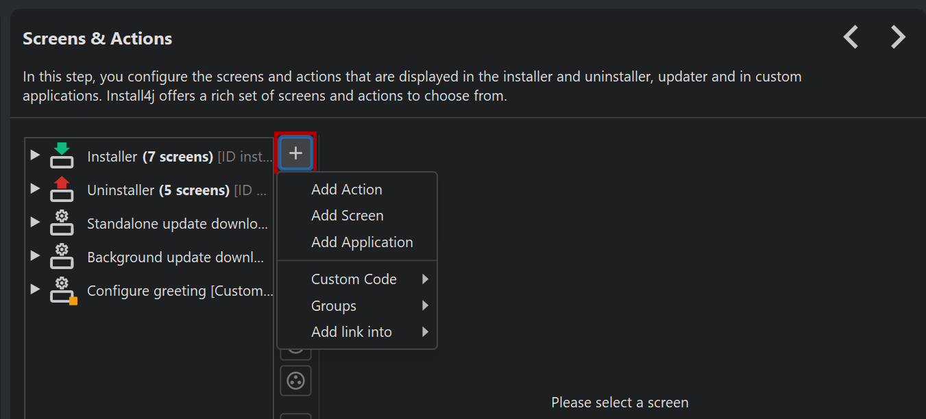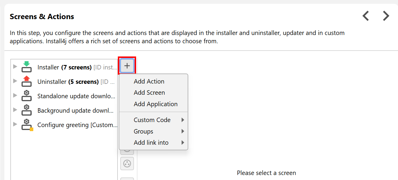In this chapter, the functionality and configuration options on the "Installer->Screens & Actions" step are discussed, the underlying concepts are discussed in a different help topic.
