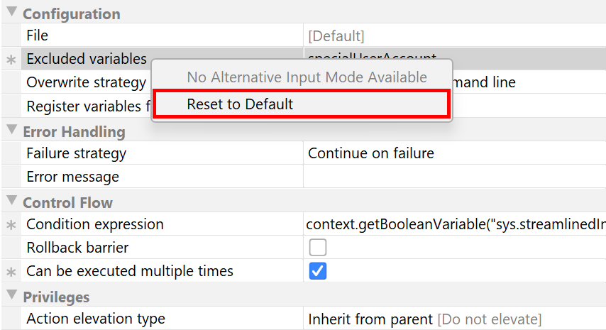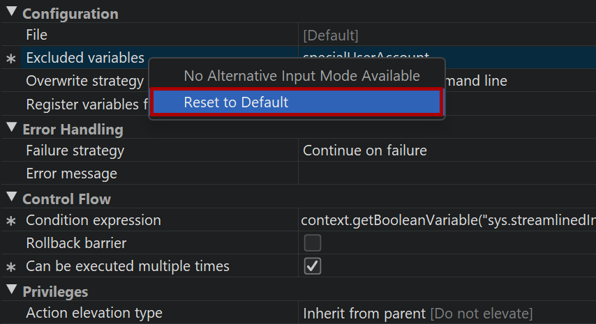 If you select a single installer element in the tree of installer elements, you can edit its properties on the right side. Properties that have been modified are shown with an asterisk (*) in front and can be restored to their default value with the "Reset To Default" action from the context menu.