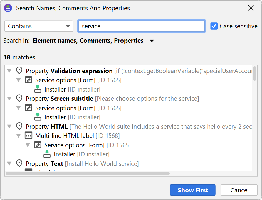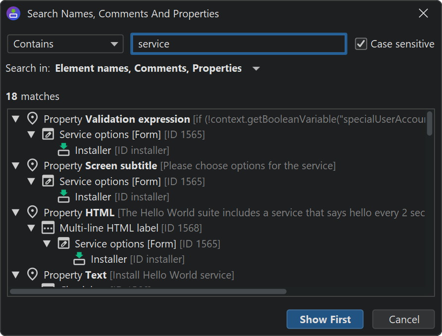 When a match is found the result tree shows the match at the top together with the reverse chain of installer elements that lead to it. You can either show the match itself or select any other element in the result tree and show that element instead when closing the dialog with the Show button. This works even if the target element is in a form component dialog or an action list or a property. The scope of the search is always rooted in the installer elements that are reachable from the current view.