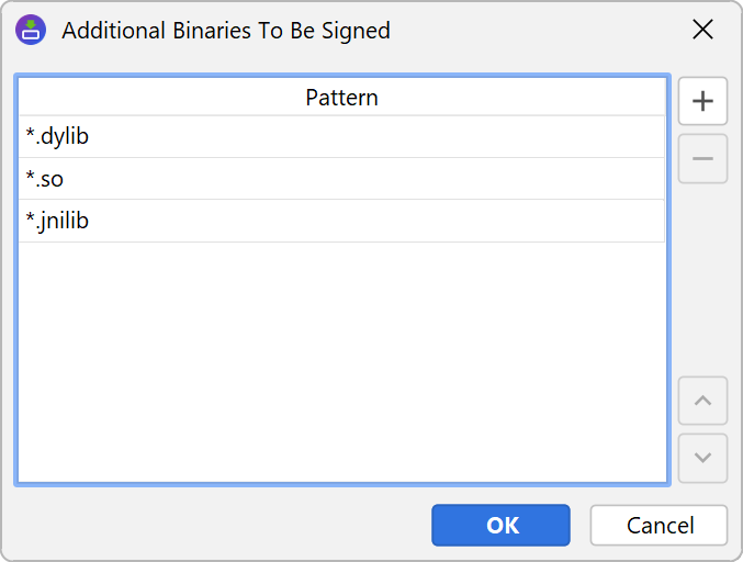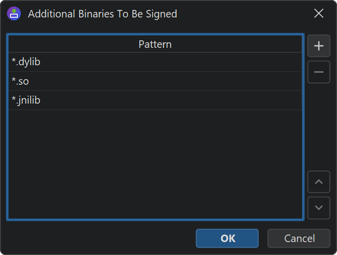 In addition, you can configure a list of name patterns for JAR files that should be scanned for binaries with the above name patterns. This only works for unsigned JAR files because the modification introduced by the signature would break the signature of a signed JAR file and install4j has no way of regenerating that signature.