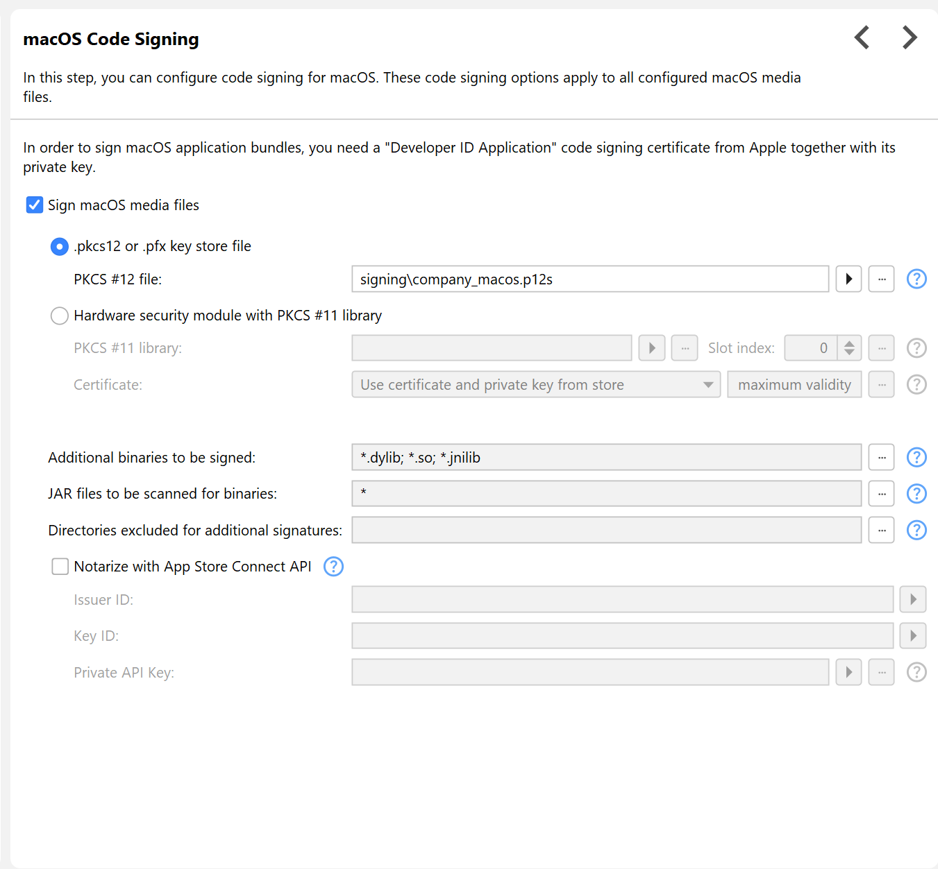 For this purpose, install4j lets you configure a list name pattern for binaries. All files in the distribution tree are matched against these patterns, and if a match is found, the corresponding file is signed if it is really a MACH-O binary. The reason why install4j cannot just automatically check all files in this way is that this check is rather expensive.