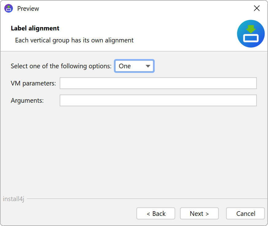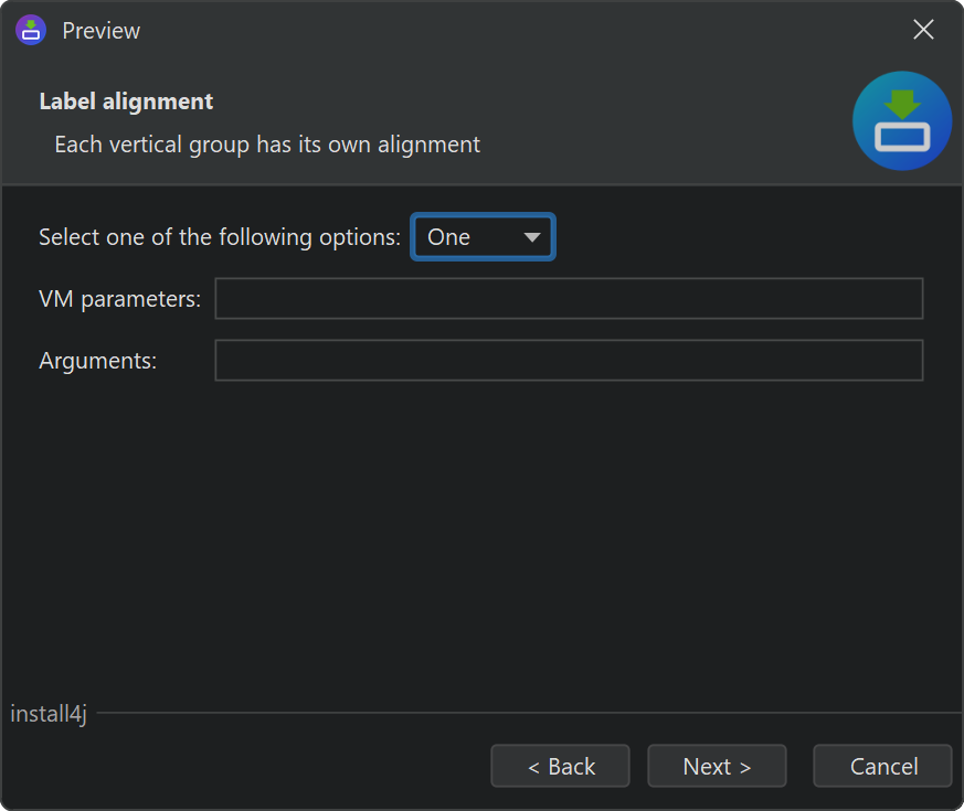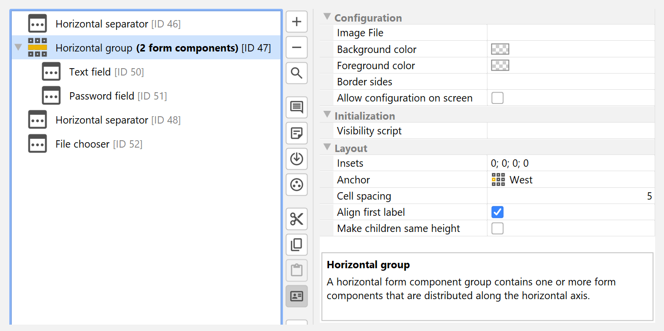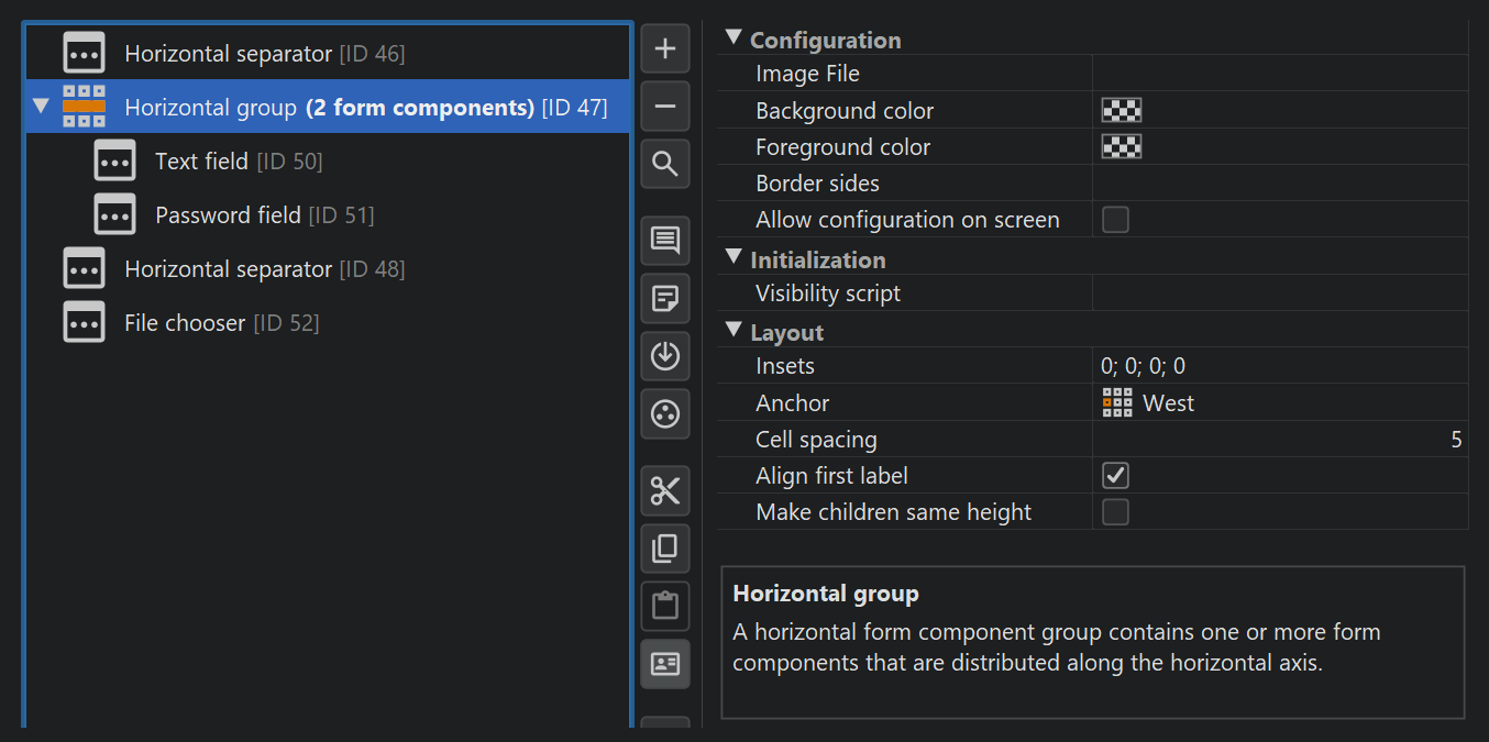 The leading labels of the first form component in the horizontal layout group ("User:") and those of the form components on the same level as the horizontal group ("Key file:") are aligned. There is a property on the horizontal layout group to switch off this alignment.