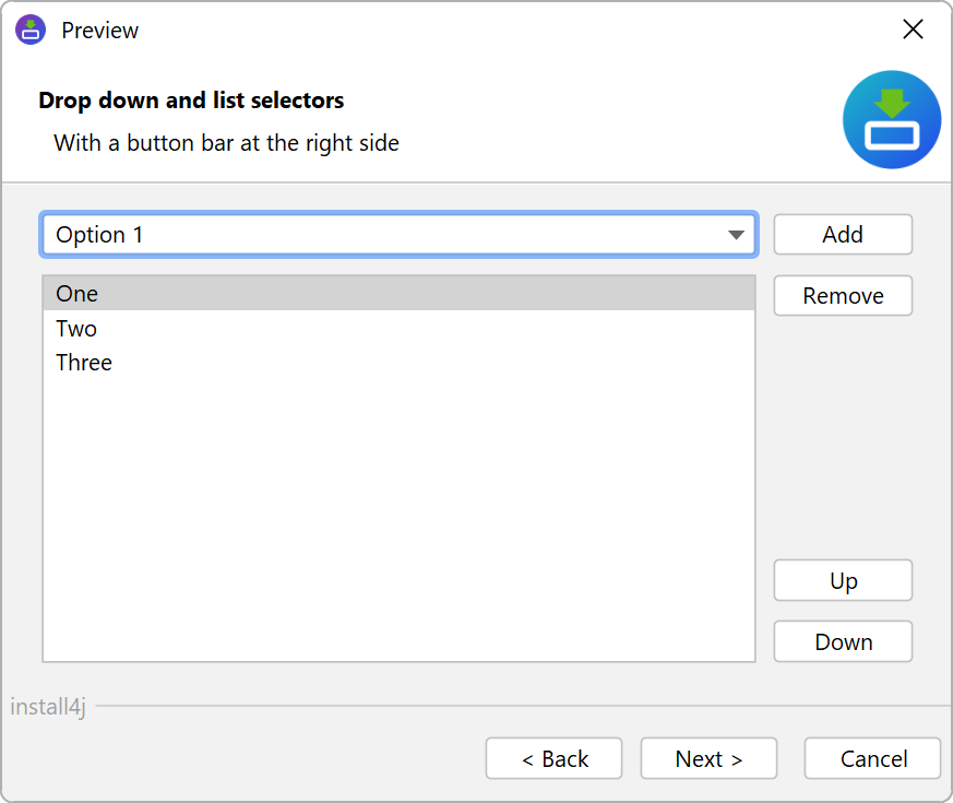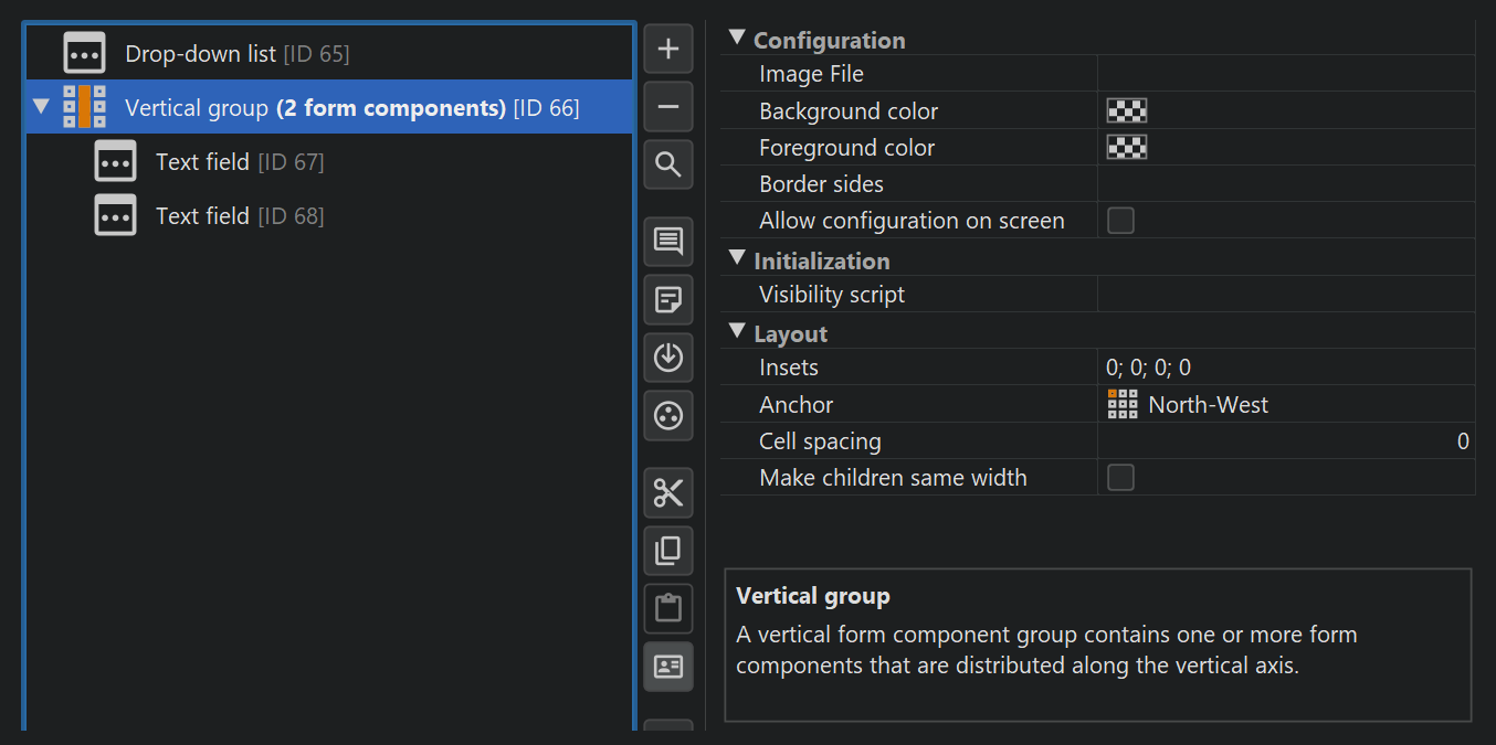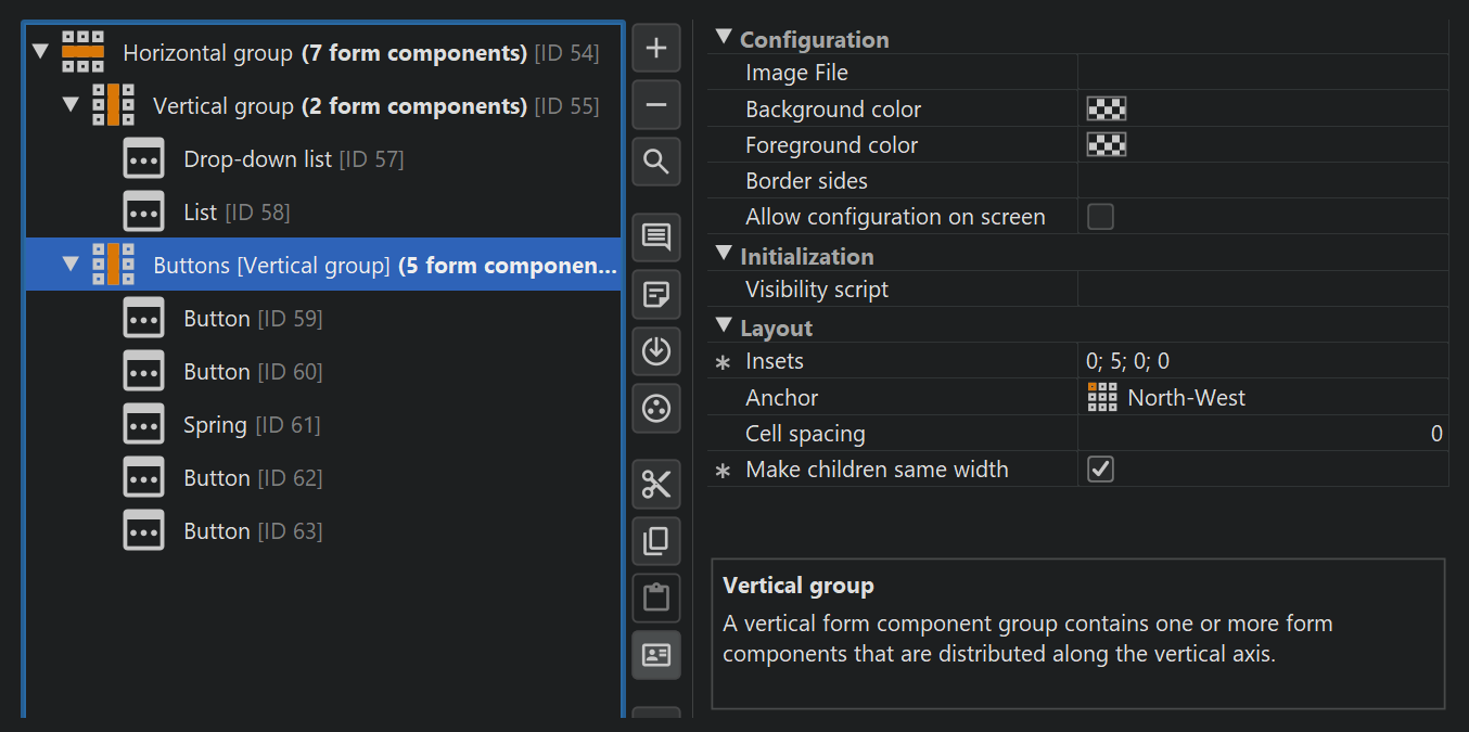 In this case the second column with the buttons takes up a fixed amount of horizontal space, because buttons do not automatically grow beyond their preferred size. To make all buttons of equal size, the "Make children same width" property has been selected. Two buttons are aligned at the top of the column, two buttons at the bottom. This is achieved with a "Spring" form component after the second button that has its axis set to "Vertical". It pushes all further components to the bottom.