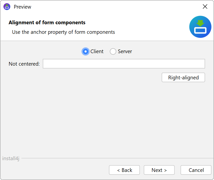 For the layout group with the radio button group, the anchor has been set to "Center", for that with the button the anchor has been set to "East". This only works with form components that do not grow horizontally. Some form components that do grow horizontally can be restricted to a fixed horizontal size, such as the text field by specifying a non-zero column count.