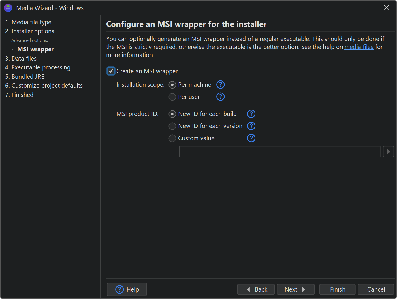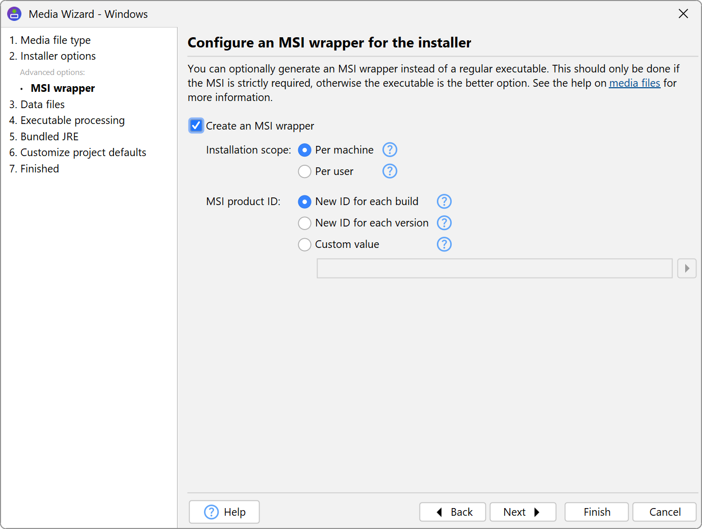 Optionally, you can create an MSI wrapper instead of a regular executable. This is configured on the "MSI wrapper" advanced options step below the "Installation options". It is not recommended to use the MSI wrapper without having a specific requirement for it. The MSI wrapper adds a lot of extra process machinery and additional logic to bridge mismatches between the concepts of install4j and MSI. This results in additional overhead, increased temporary disk space requirements, reduced responsiveness and extra considerations for the non-GUI installer modes.