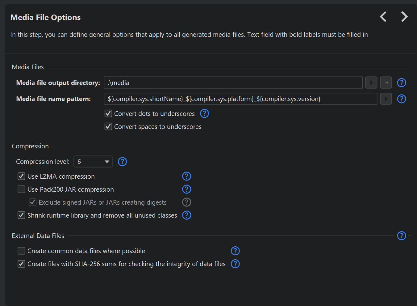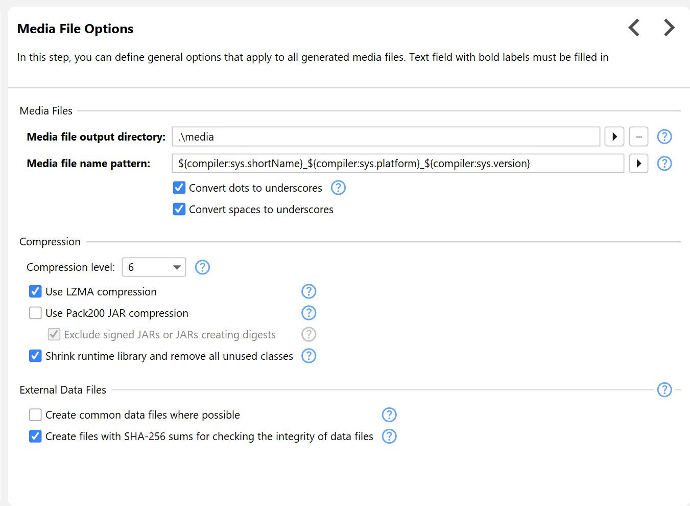 Common options for all media files, such as the destination directory, a pattern for naming the output file and compression options are defined on the "General Settings->Media File Options" step.