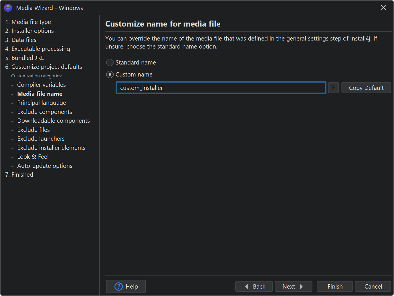 Because it is often necessary to change the name of the media file from the global media file pattern configured on the "General Settings->Media File Options" step, a separate customization step is available in the media wizard. For example, you may want to produce two different variants for the same platform with and without some particular files. To avoid a name clash of the two media files, you have to adjust the name of one or both of the media files.