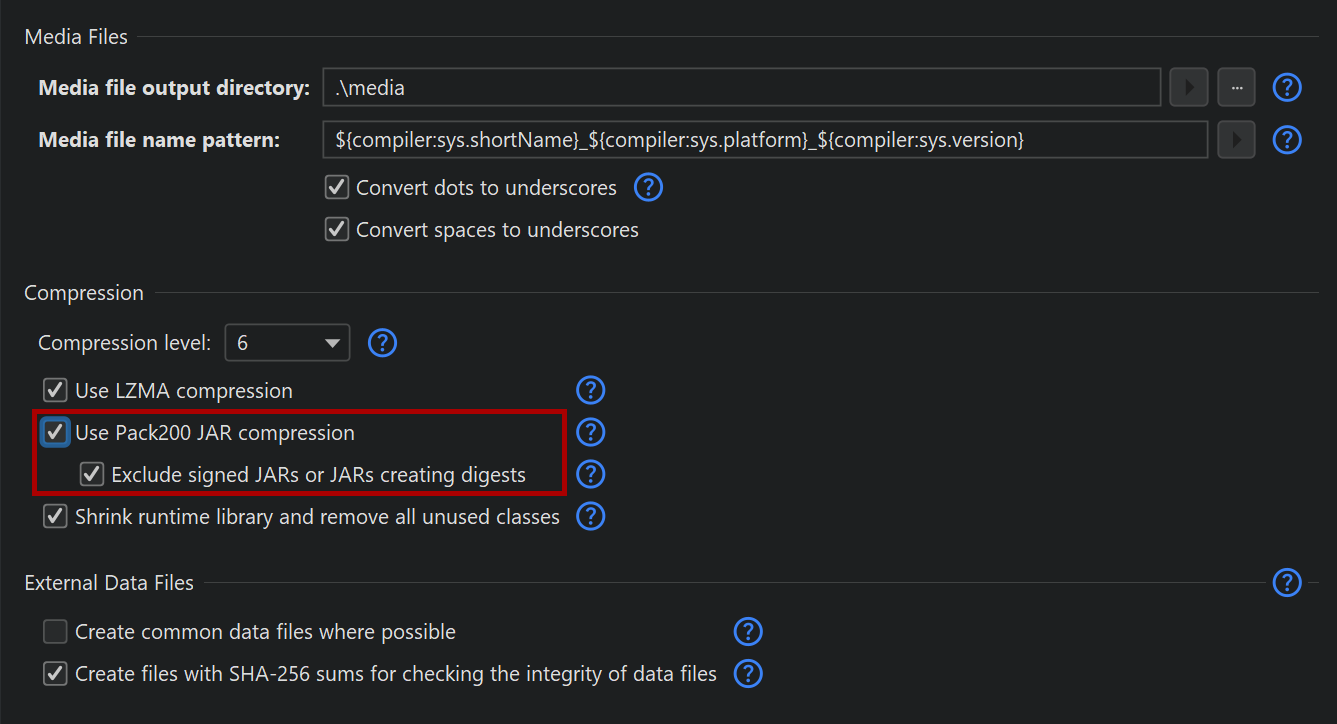 Pack200 compression is a compression algorithm that was designed for JAR files and achieves exceptional results, especially for large JAR files.