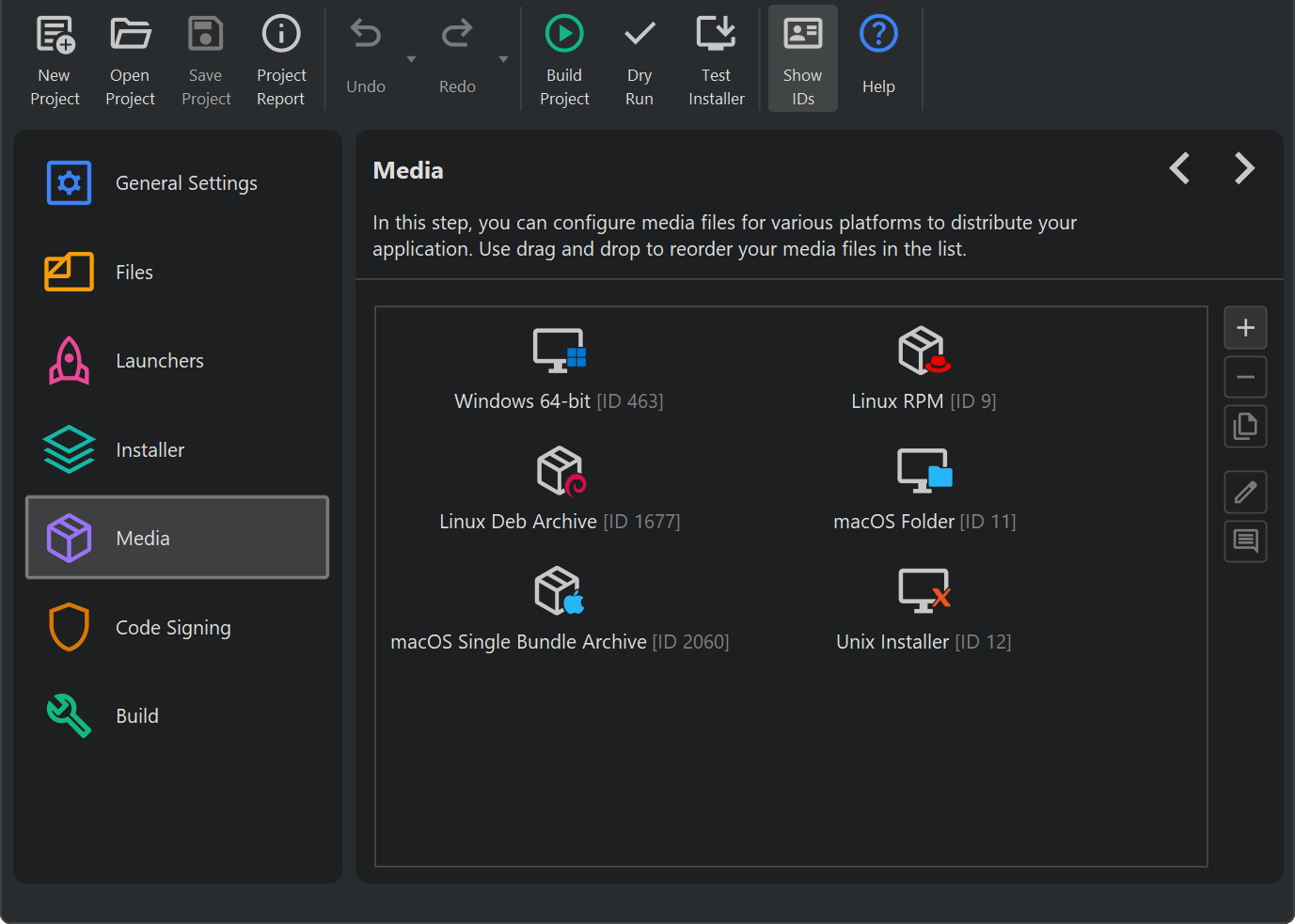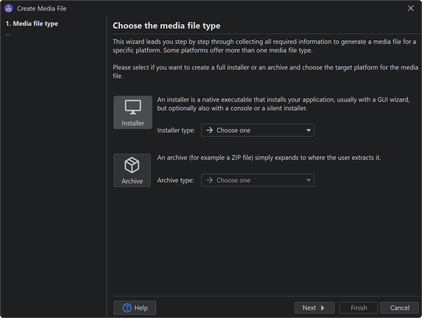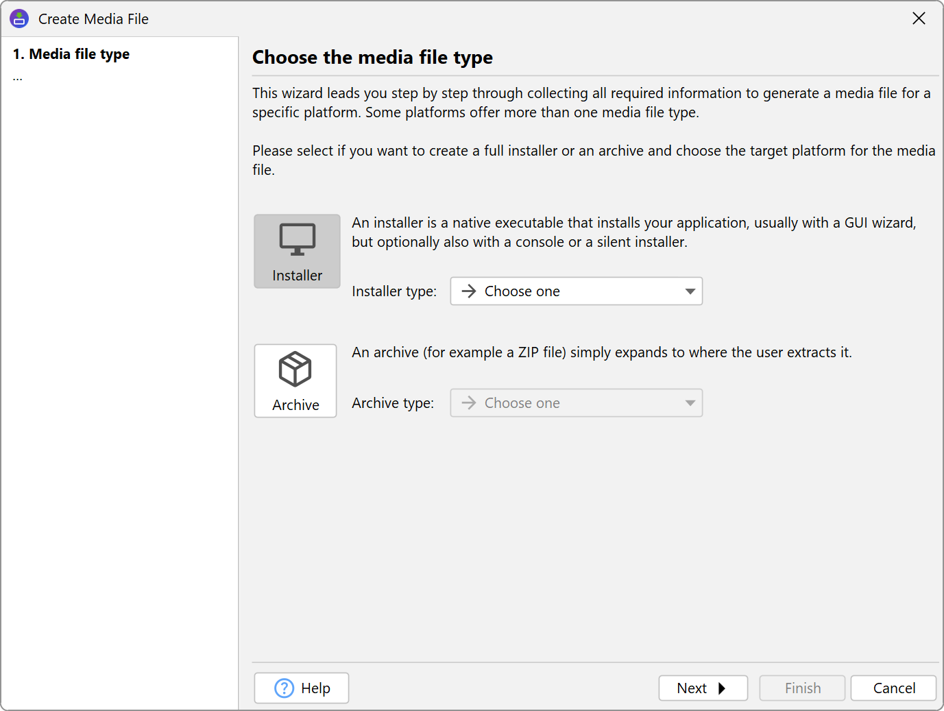 There are two fundamentally different types of media files: installers and archives. Installers support the full functionality of install4j while archives are limited in several ways.