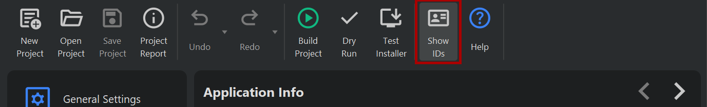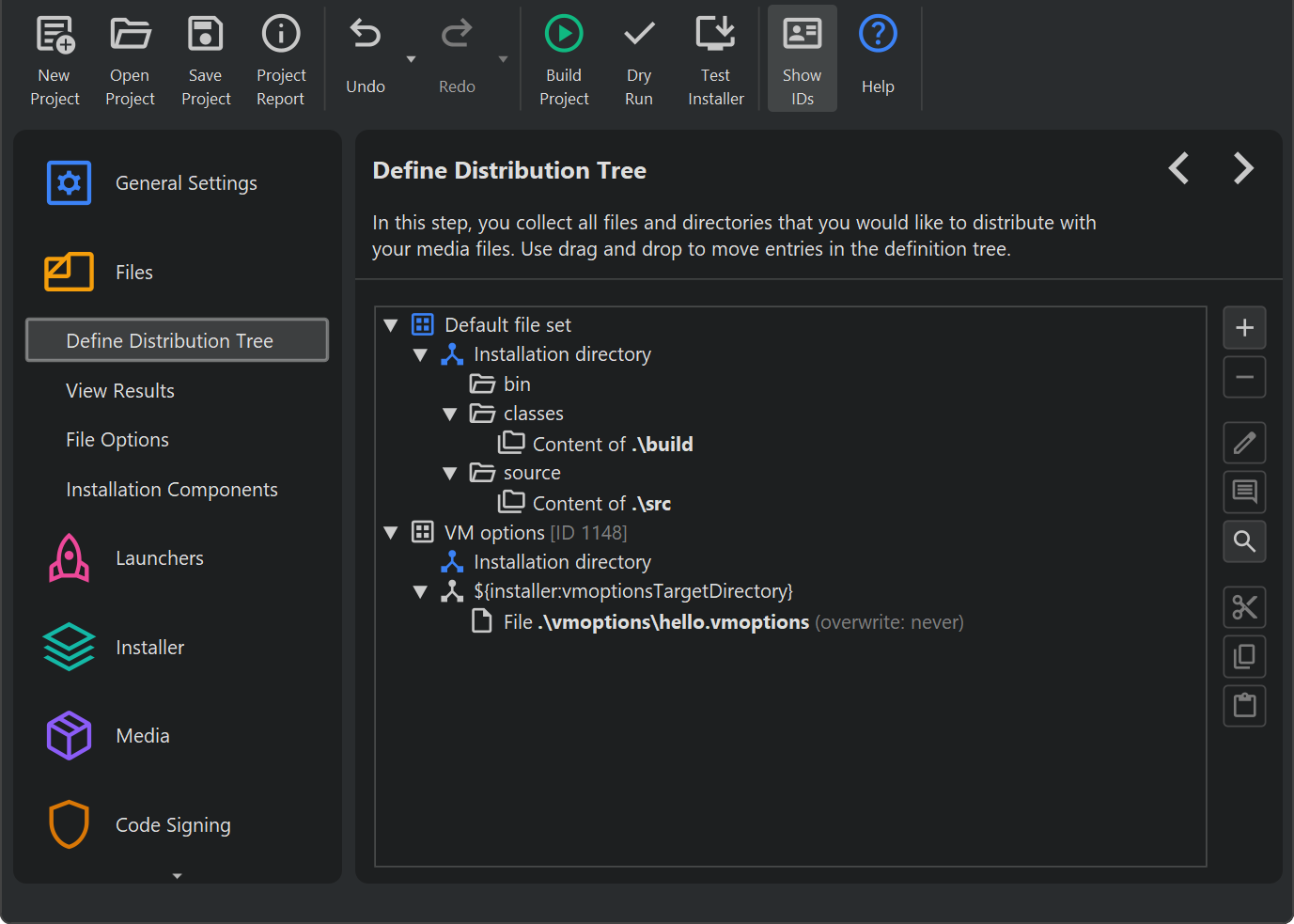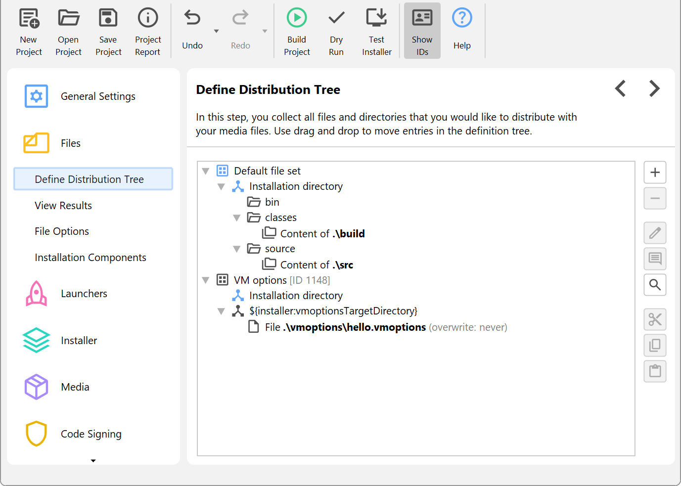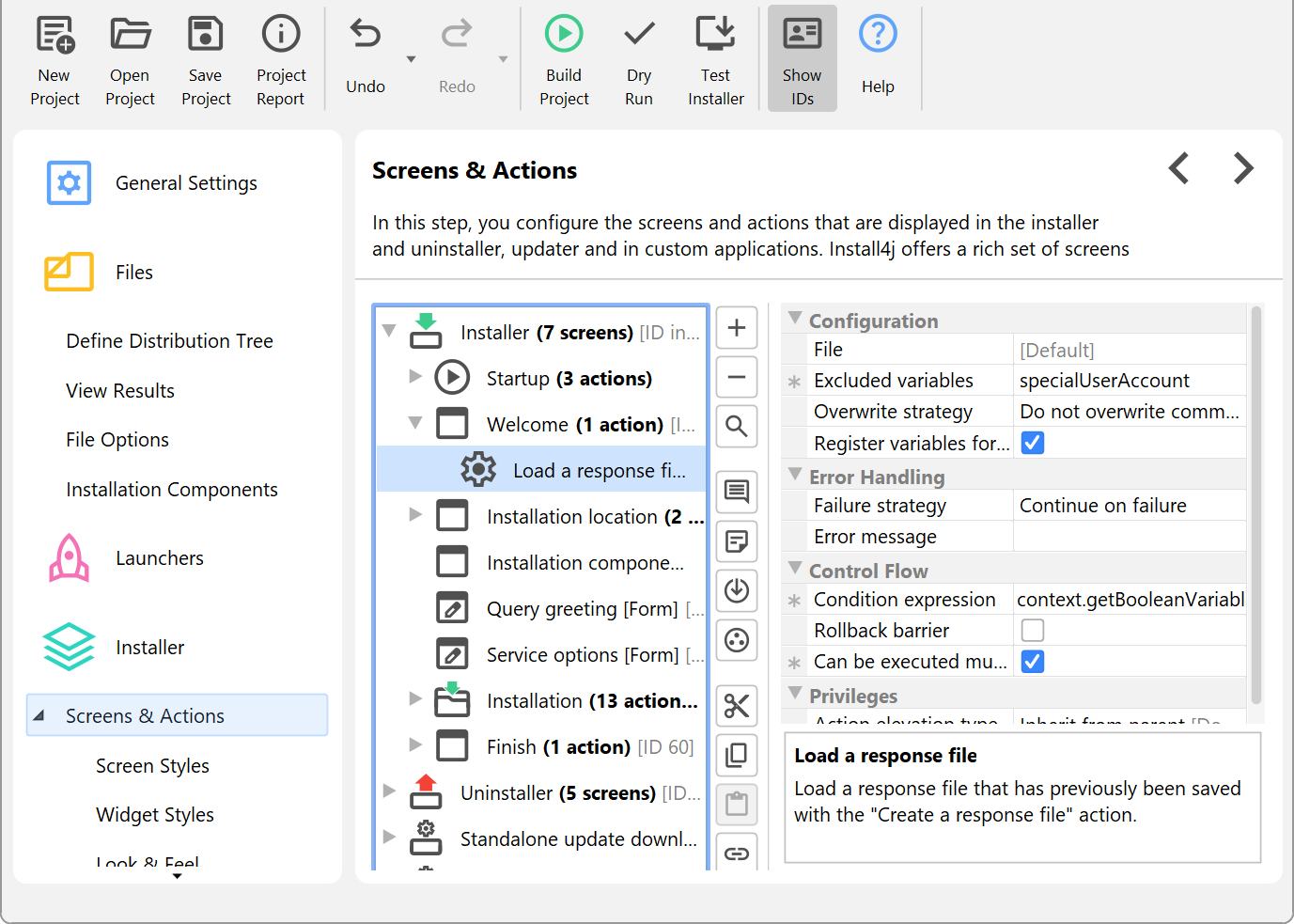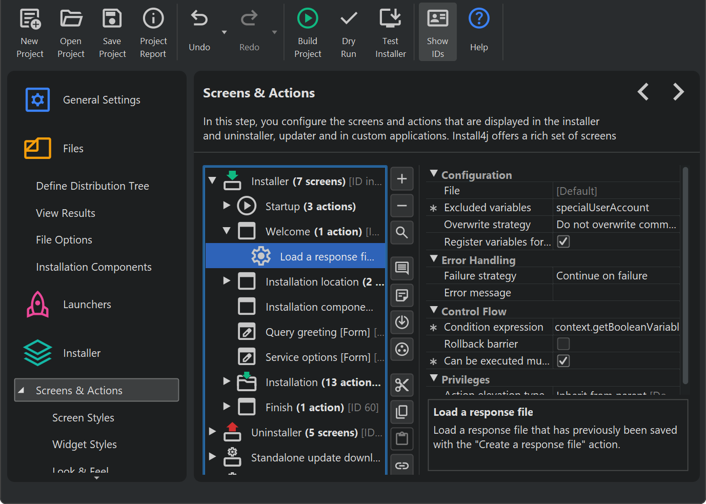 All elements in projects that can be referenced at runtime, like installation components, launchers, screens, actions, form components or media files have an automatically assigned ID. You can toggle the display of IDs globally in the toolbar. You may need to use IDs when using the API in scripts. Scripts are written in plain Java in a code editor provided by install4j.