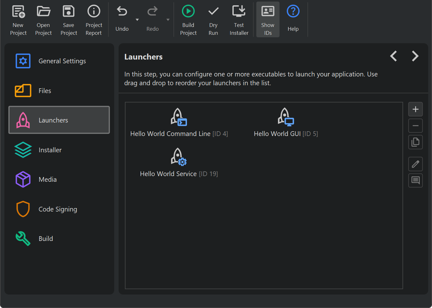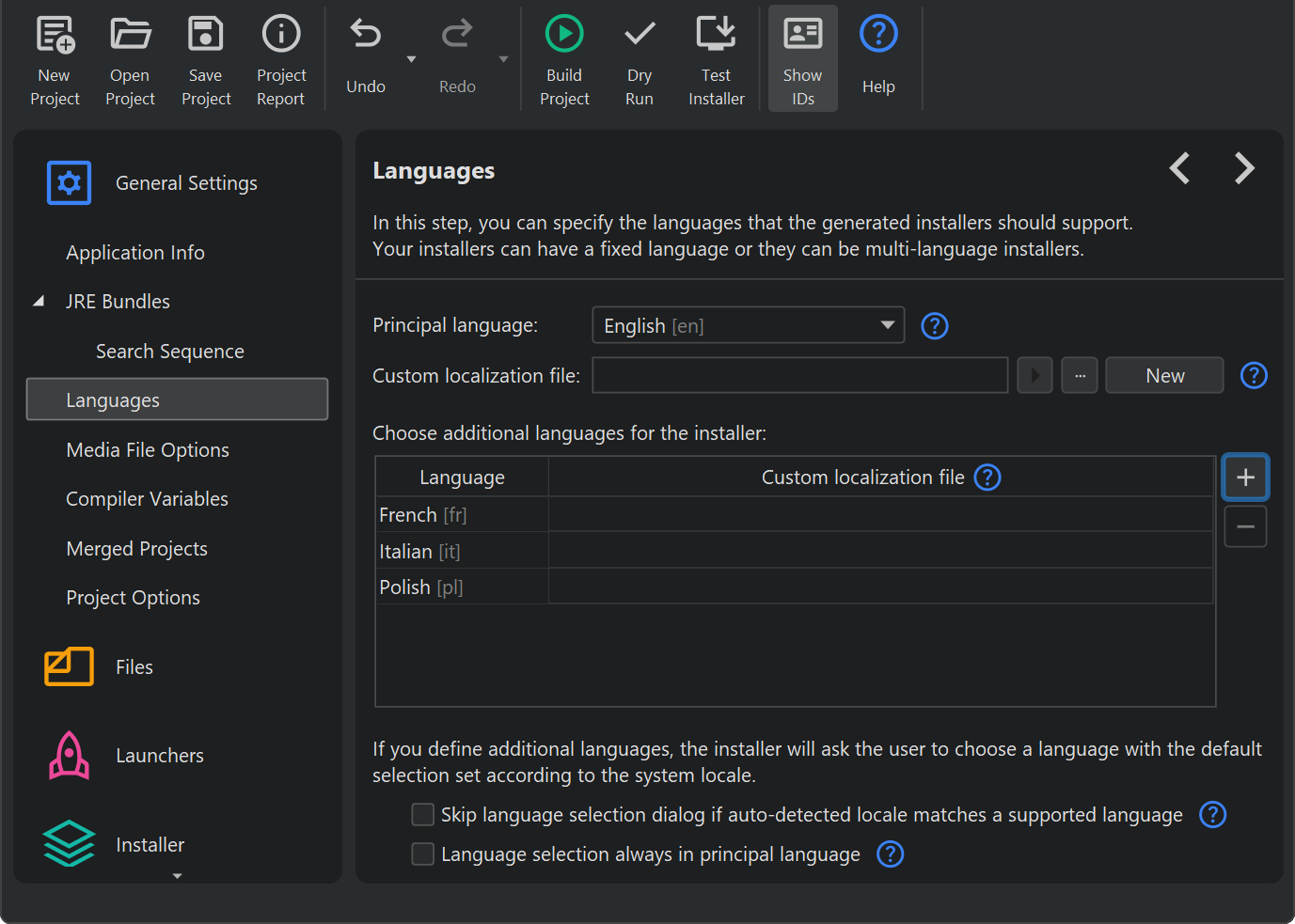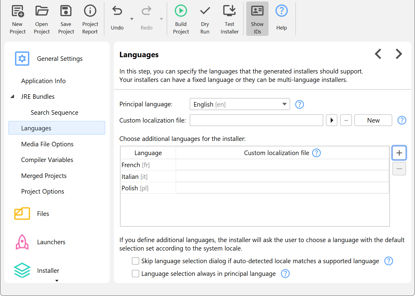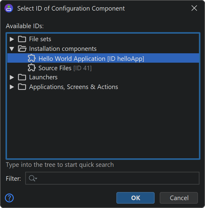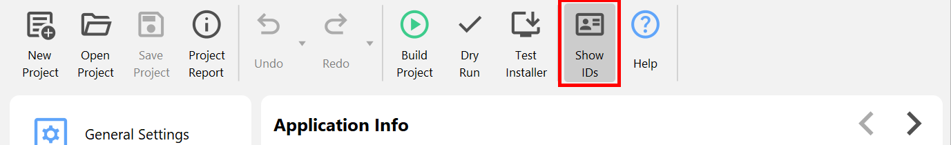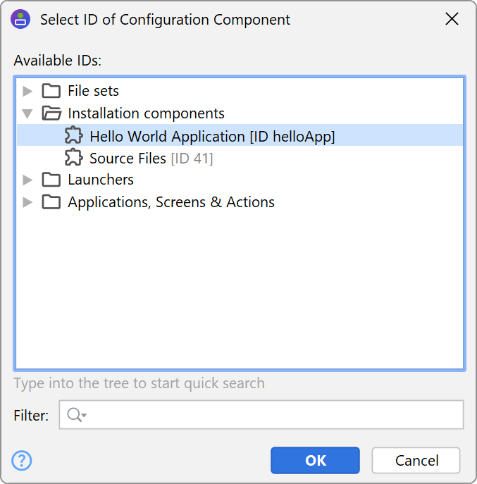 All elements in projects that can be referenced at runtime, like installation components, launchers, screens, actions, form components or media files have an automatically assigned ID. You can toggle the display of IDs globally in the toolbar. You may need to use IDs when using the API in scripts. Scripts are written in plain Java in a code editor provided by install4j.