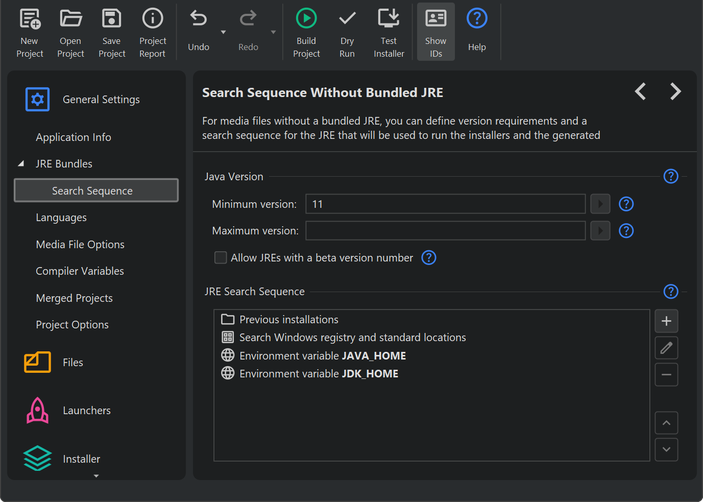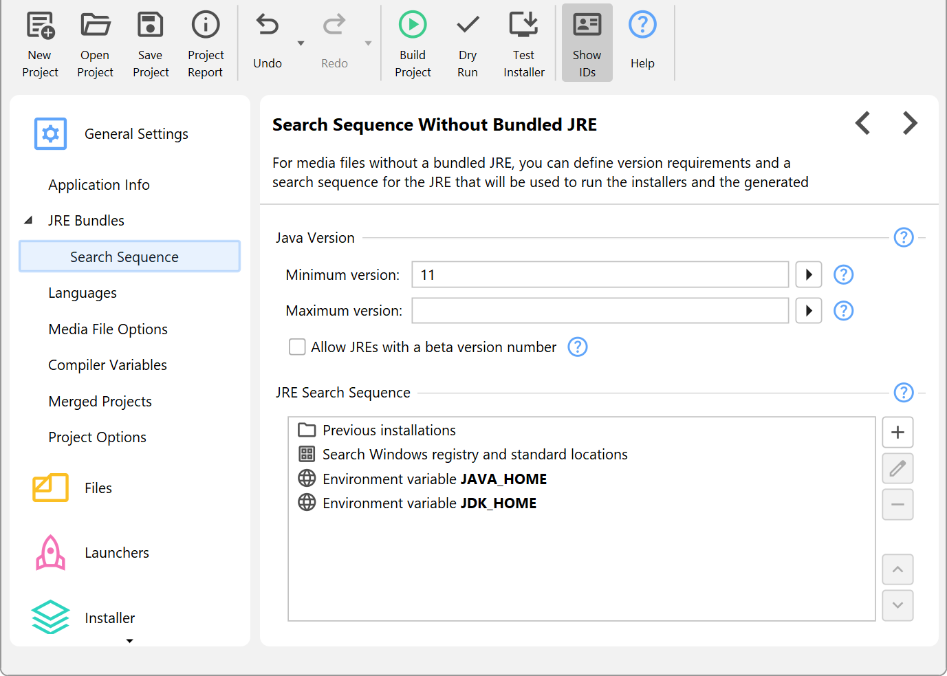 install4j has many advanced features concerning bundling of JREs or the runtime-detection of an installed JRE. Bundling of JREs is configured on the "JRE bundles" step and can be refined on a per-media file basis. If you do not wish to bundle a JRE, you define Java version constraints and a search sequence for both your installers and your generated launchers. In this way, you ensure that the launchers run with the same JRE as your installers.