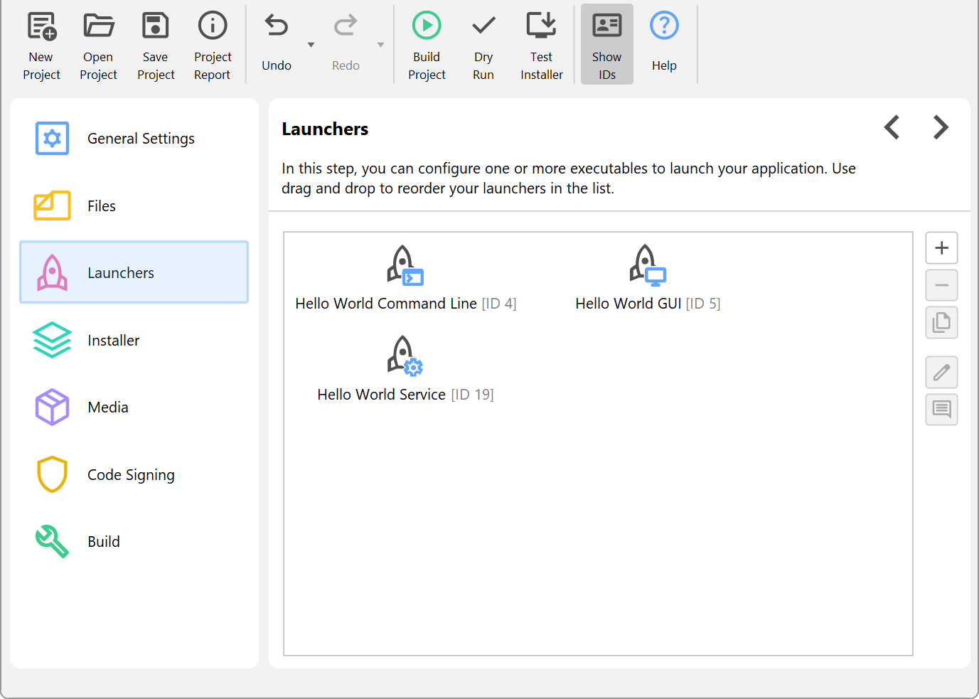 Unless the installed files are only static data, you will need application launchers to allow the user to start your application. You can define one or several application launchers in the "Launchers" section. Launchers generated by install4j have a rich set of configuration options, including an optional splash screen or advanced features like a single instance mode. Configured launchers can also be "services" that run independently of logged-on users. install4j offers special installation screens and actions for services.