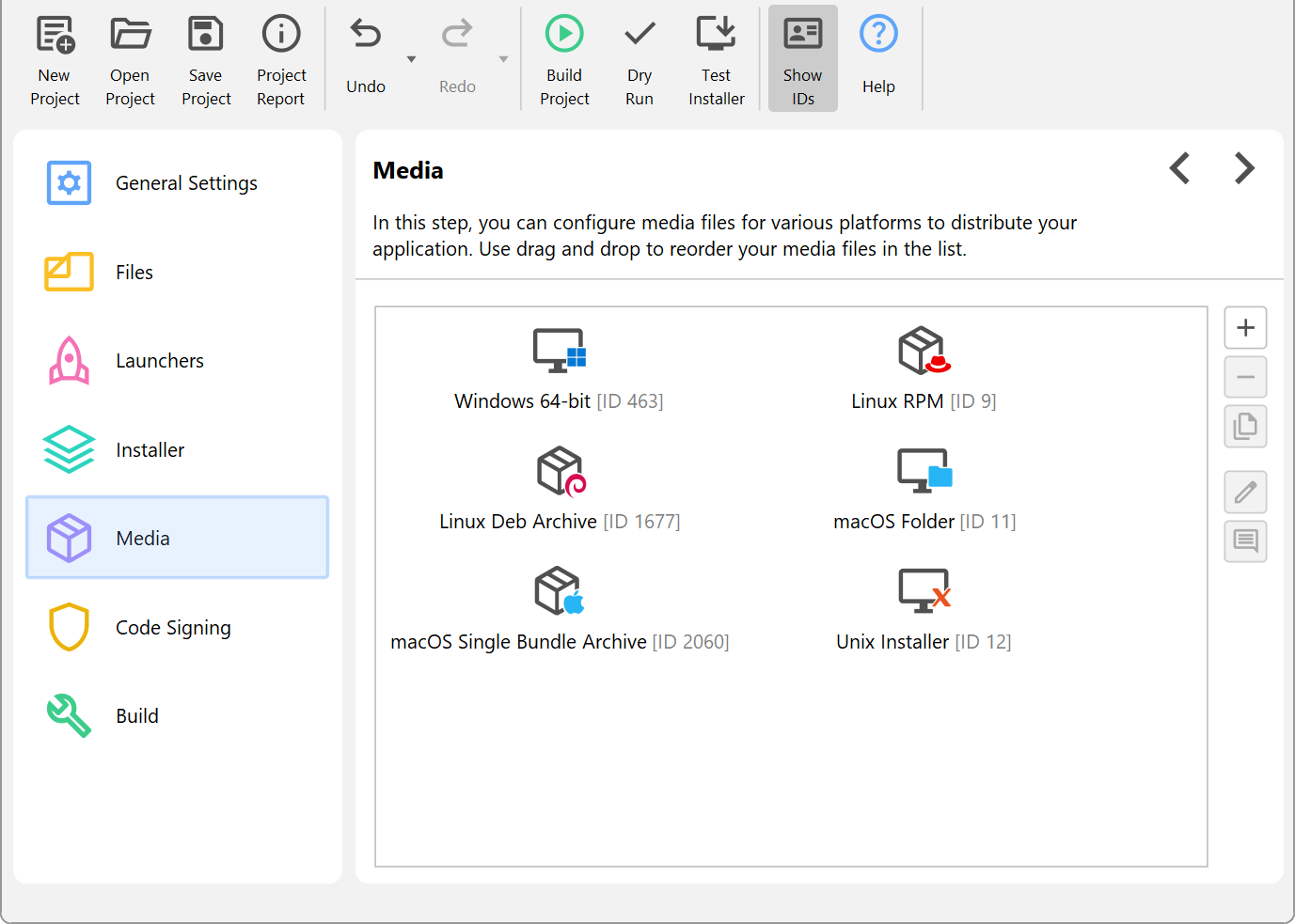 Finally, the media file definitions define the actual executables that you distribute. They capture platform-specific information and provide several ways to override project settings. You typically define one media file for each platform. Multiple media files for the same platform can be added as needed. Media files are either installers or archives. Archives simply capture the launchers and the distribution tree. They are a limited way to create a distribution and might not be suitable if you rely on the flexibility that is offered by installers.