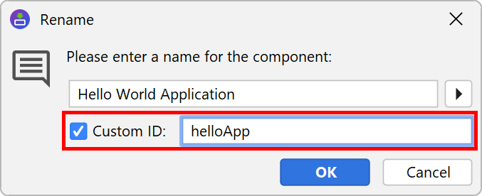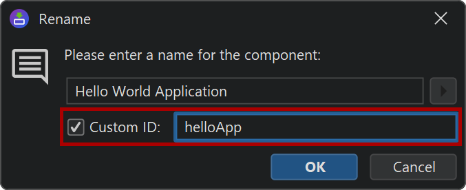 If you would rather not reference automatically generated IDs in your scripts, you can specify your own custom IDs. Custom IDs can be assigned by using the "Rename" action for the selected element and selecting the "Custom ID" check box in the rename dialog. Custom IDs must not start with a number. The numeric internal ID is never discarded. If you disable the custom ID at a later point, the ID will be reverted to the previous numeric ID.