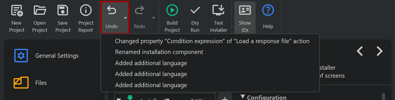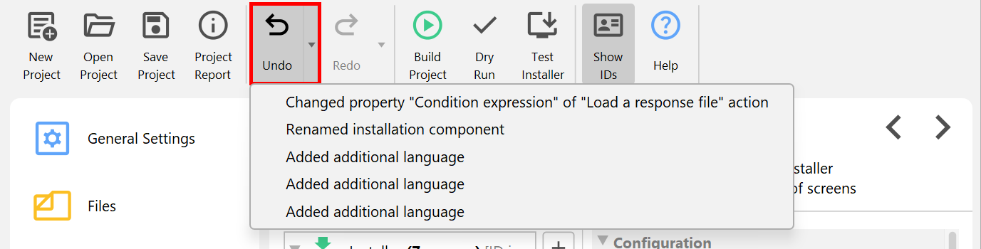 All changes in the install4j IDE can be undone with the undo toolbar button. The arrow on the right side opens a list of changes in a popup menu for inspection. Selecting one of these entries undoes all changes up to and including the selected change. The same feature is available for redoing undone changes.