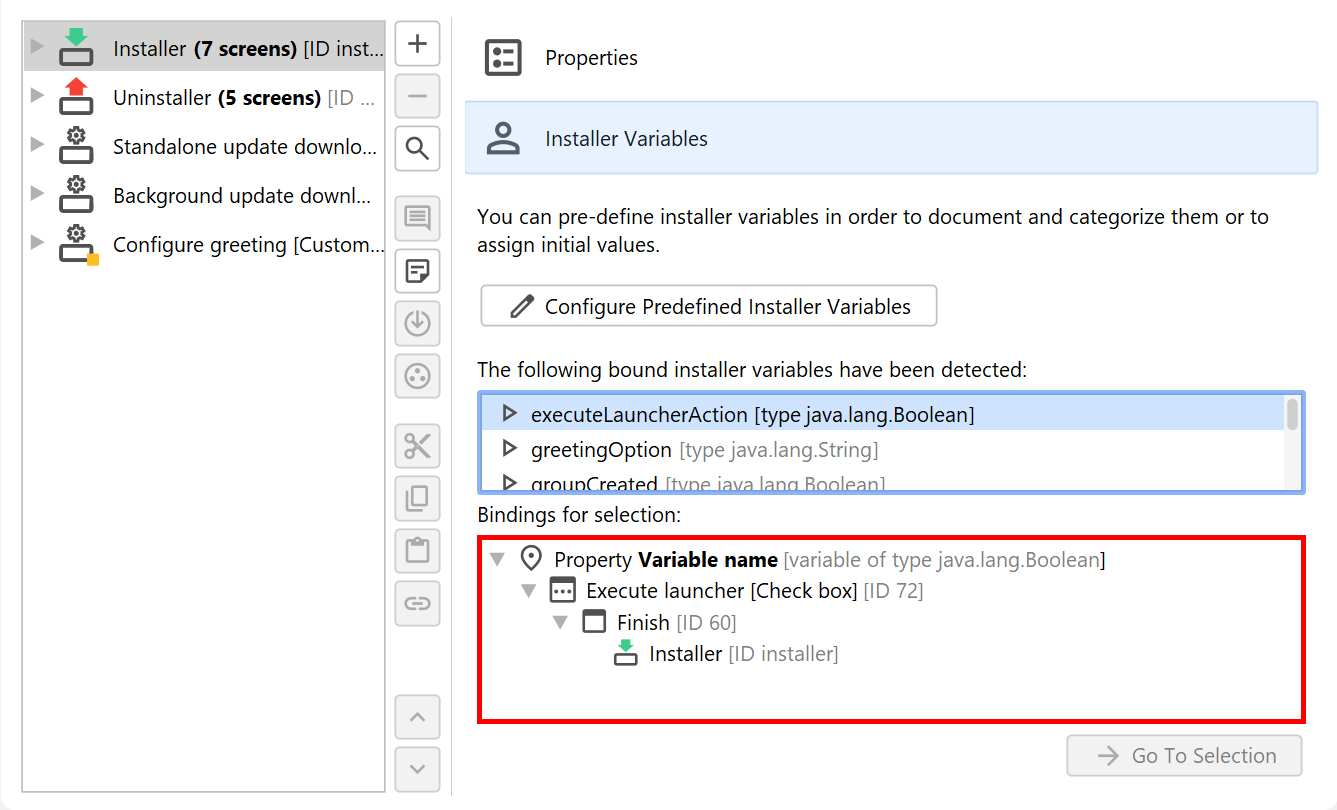 The value of a launcher variable is a string that is not known at compile time. In contrast to installer variables, they are replaced by the launcher and not by Java code, so the replaced value is seen by the JVM at startup. Launcher variables can only be used in the "VM parameters" and "Arguments" text fields on the "Java invocation" step of the launcher wizard.