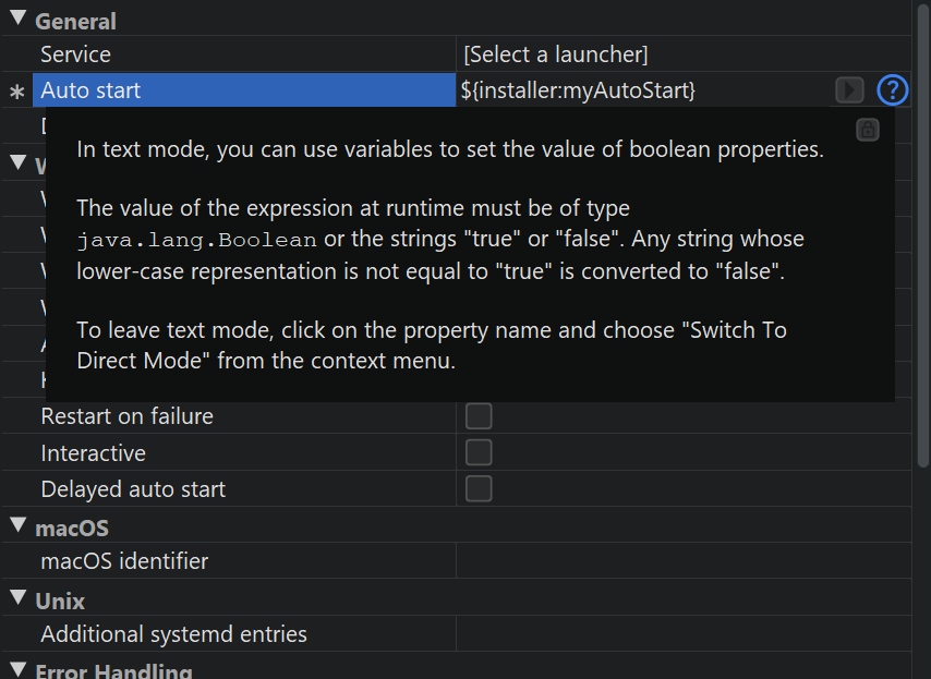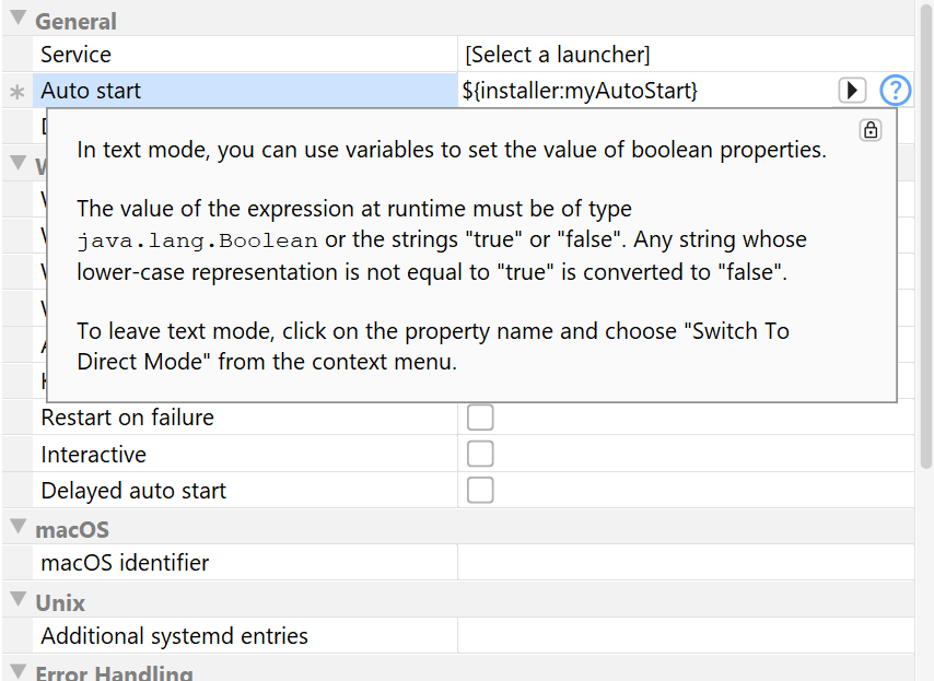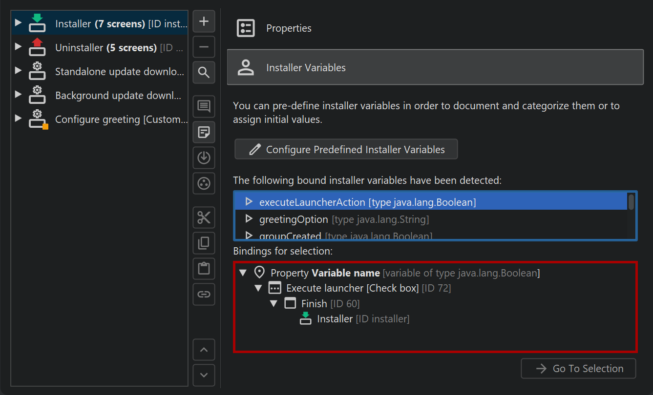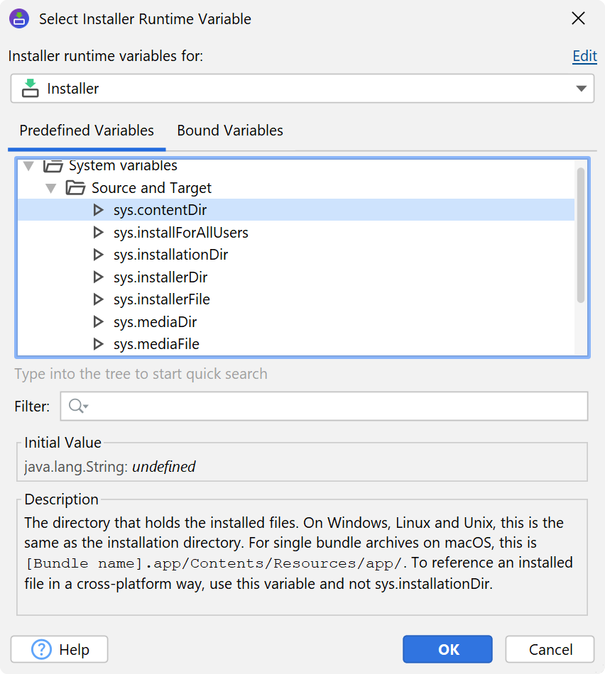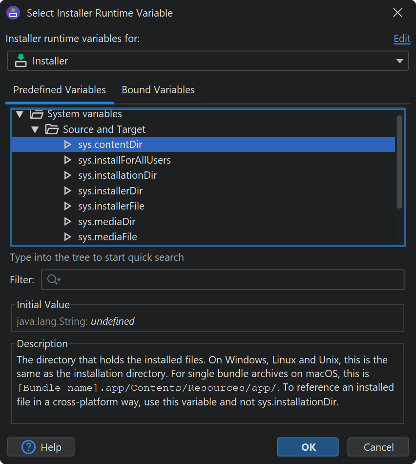 Text fields in the install4j IDE where you can use variables have a variable selector next to them. In the popup menu, you first choose a variable system from the available variable types. In text properties of an installer element or a form component, you can use compiler variables, installer variables and custom localization keys, but not launcher variables.
