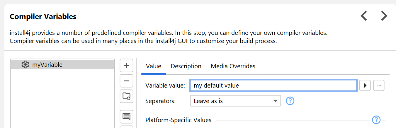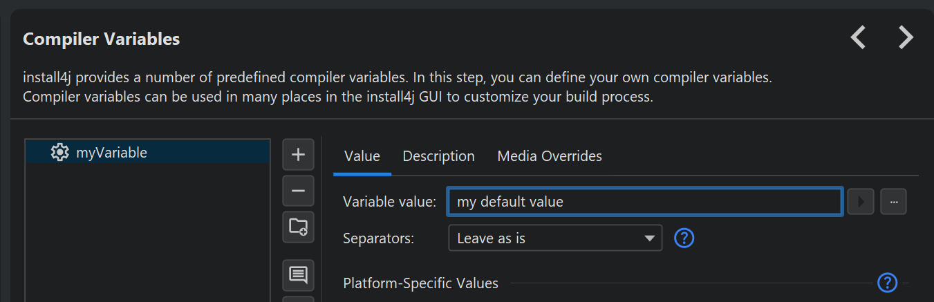 Compiler variables often refer to paths either on the build machine or on the target machine. install4j has no way of knowing whether the value is actually a path and where it is necessary, so it does not replace file or path separators by default. With the "Separators" drop-down right below the variable value, you can choose to replace file separators and path separators: You can either replace them for the build platform where the install4j compiler is running or for the target platform associated with the currently compiled media file. This can be much more readable that using the explicit compiler variables:
