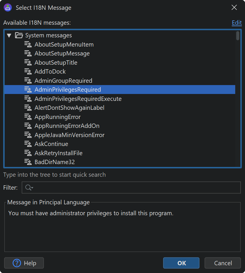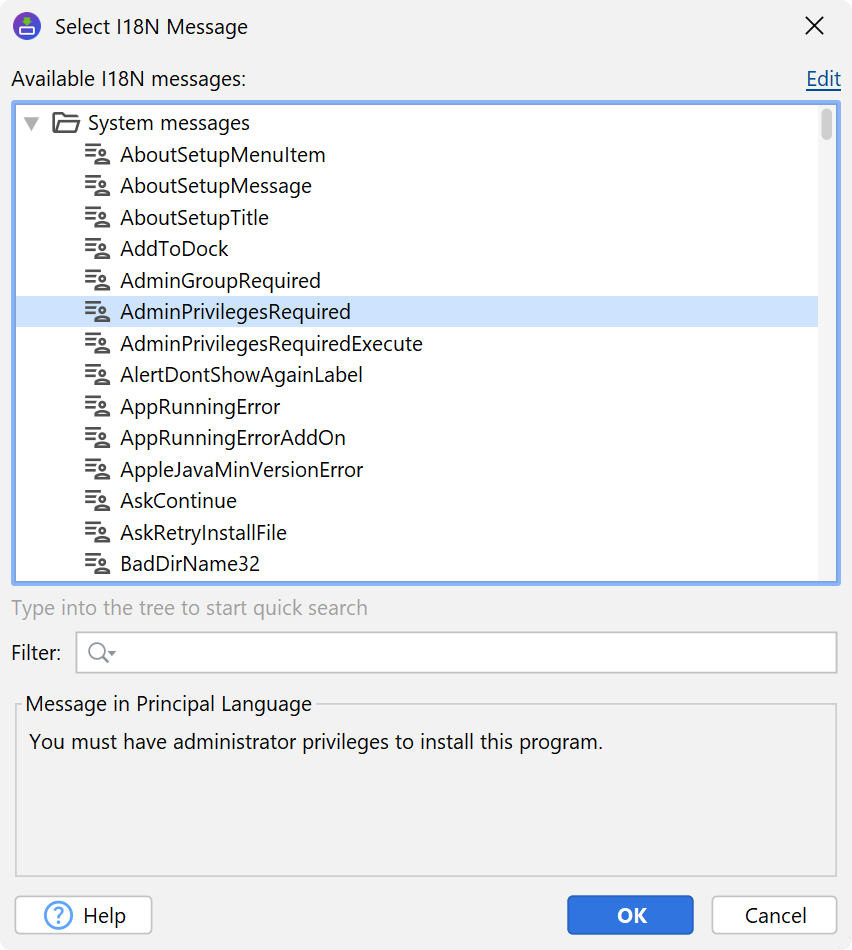 The value of an I18N message depends on the language that is selected for the installer. You can use this facility to localize messages in your installers if they support multiple languages. To do that, you supply key-value pairs in the custom localization file. The variable selection dialog for I18N messages shows all system messages as well as all messages in the custom localization file for the principal language of your project.