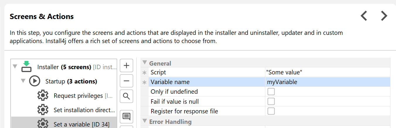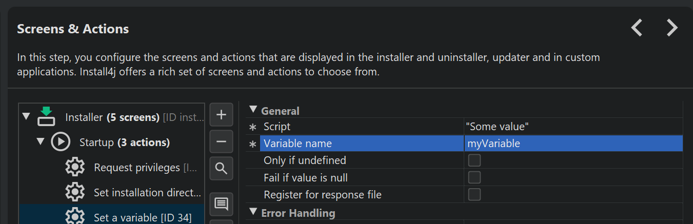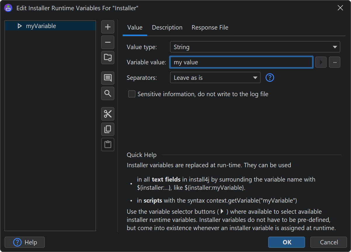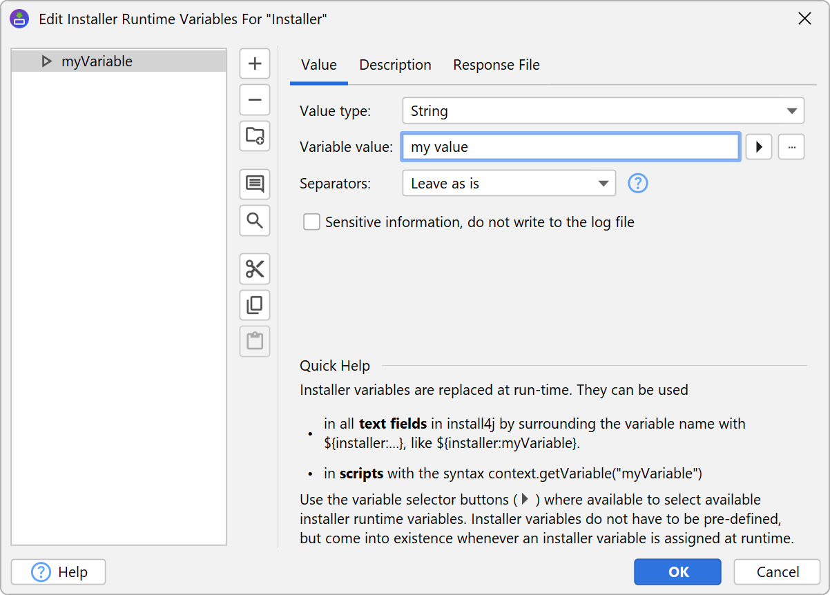 With variables you can customize many aspects of install4j. They can be used in all text fields and text properties in the install4j IDE as well as from the install4j API. The general variable syntax is