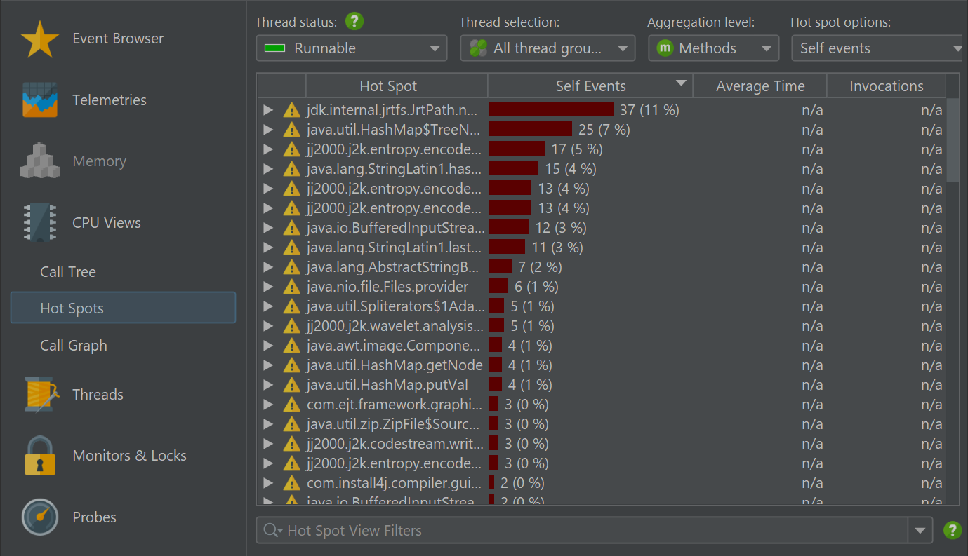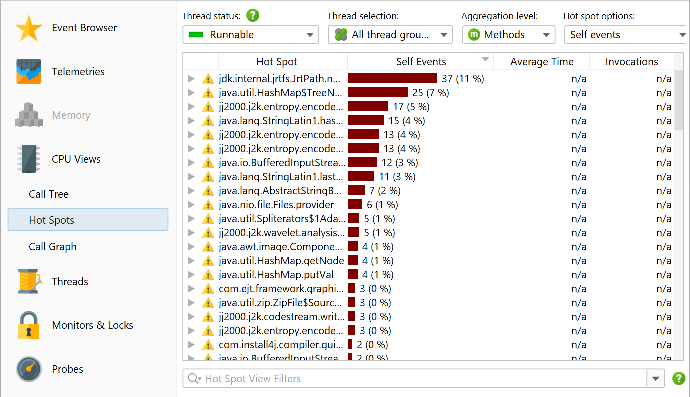 Due to the fact, that threads are sampled sporadically, it is not possible to estimate actual execution times like in a full profiling session. Rather than times, the event counts are shown in the call tree and the hot spots views. This is similar to async sampling which has the same drawback. The other JFR thread states are "Waiting", "Blocking" and "Socket and file I/O" and still measure times. Because of this discrepancy, the "All thread states" mode is not available in the thread status selector.