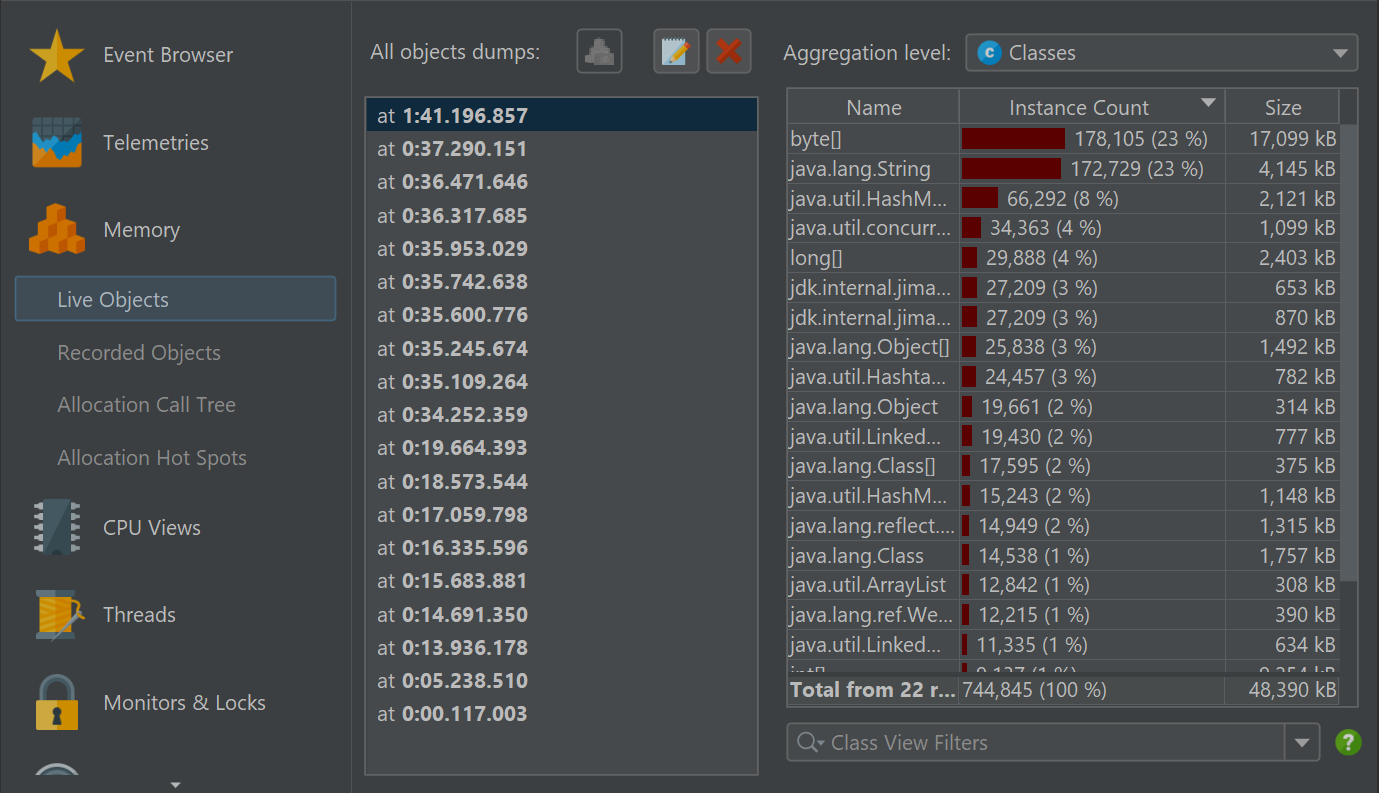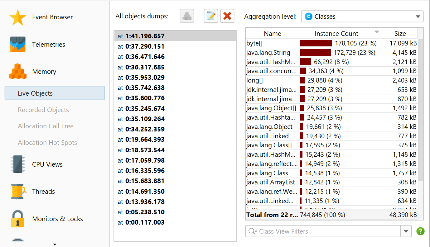 Contrary to the "Live objects" view, they only show objects that were allocated while recording was active. Allocations are sampled by JFR but the size is reported as an estimate for the total allocated size. Because of this discrepancy, the sizes reported by these views do not correspond to the sample count multiplied by the average instance size. Otherwise, these views have similar functionality to the memory views in full profiling session.