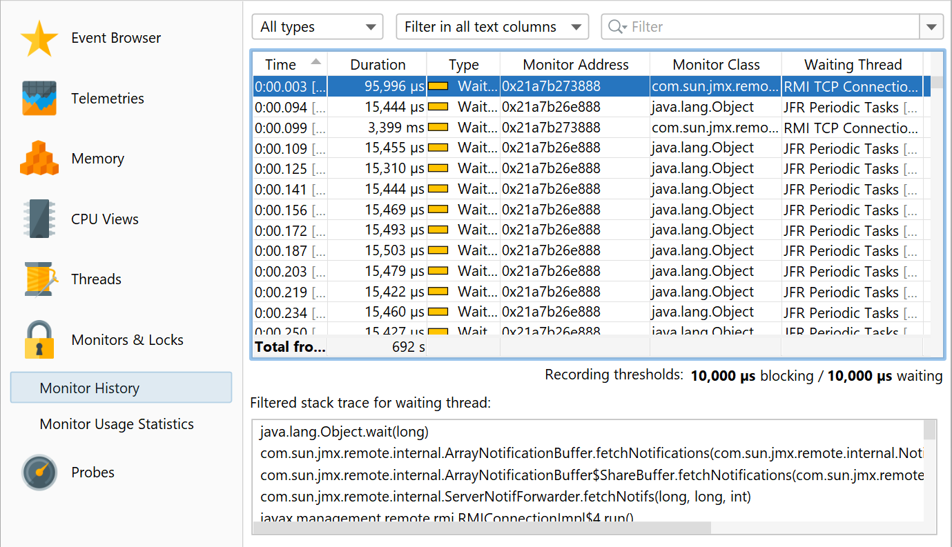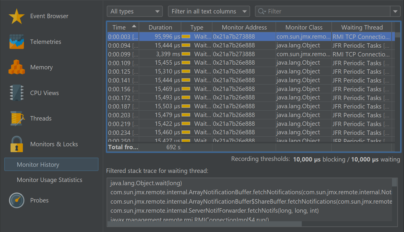 | Waiting | jdk.JavaMonitorWait, jdk.ThreadSleep, jdk.ThreadPark |