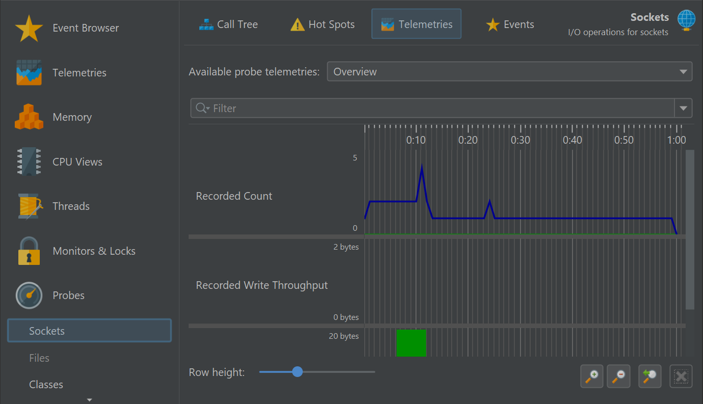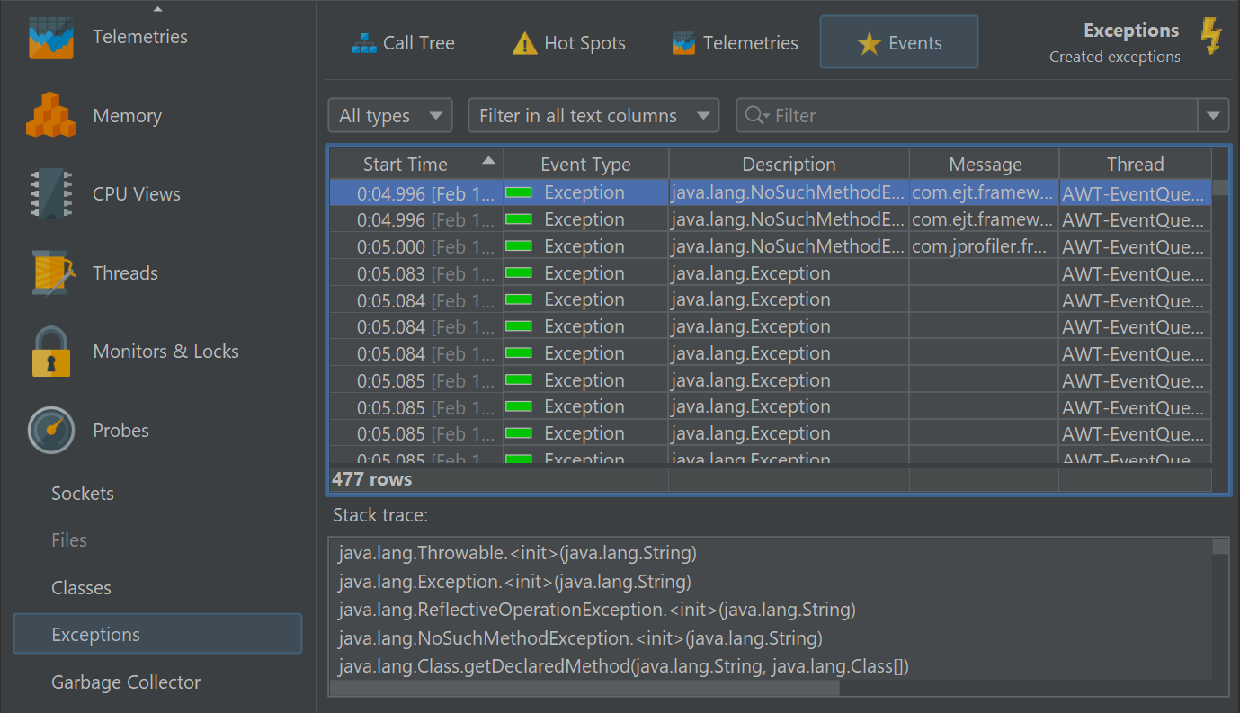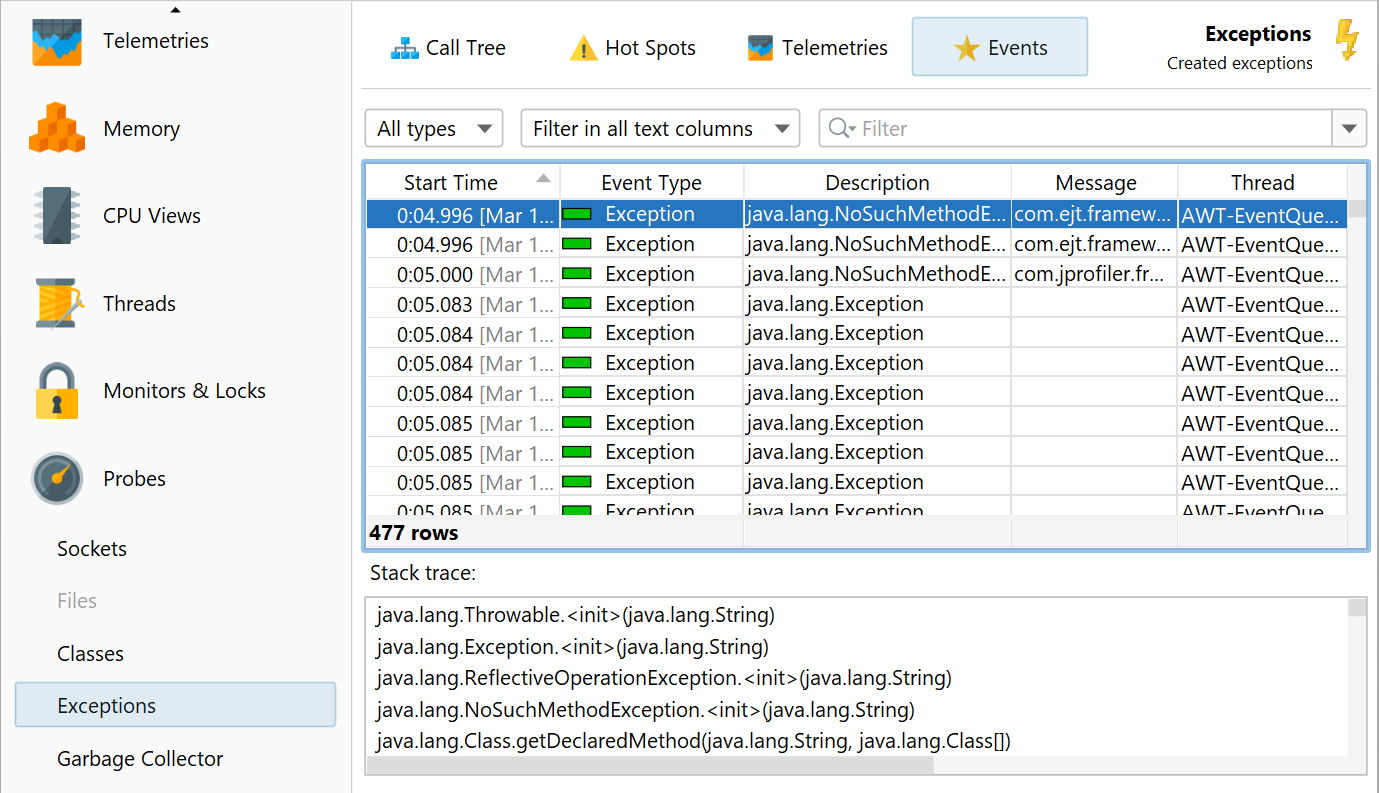 Each probe shows a number of views. In contrast to the event browser, the focus is on the aggregated data and not on the single events. This is also how probes in JProfiler differ conceptually from JFR data collection.