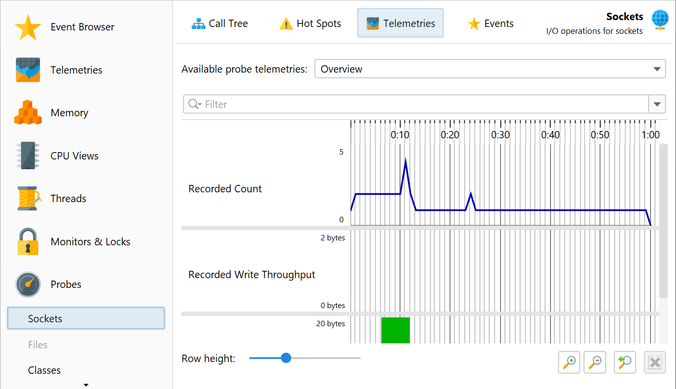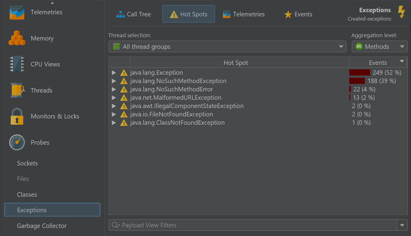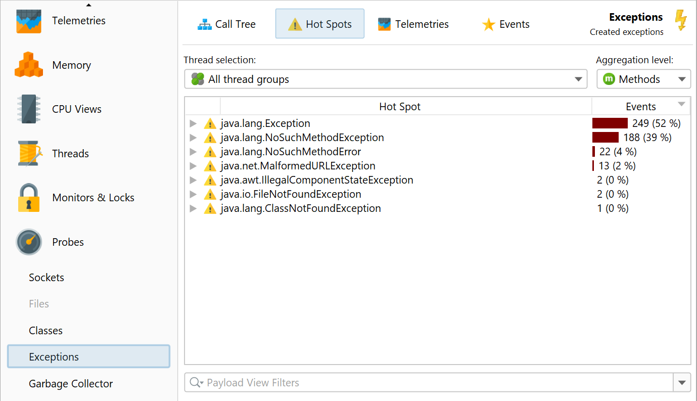 Except for the Garbage collector probe, all probes have the following views: The call tree and hot spot views allow you to choose a single thread or a thread group as well as an aggregation level. By default, all threads are shown and the aggregation level is set to "Methods".
