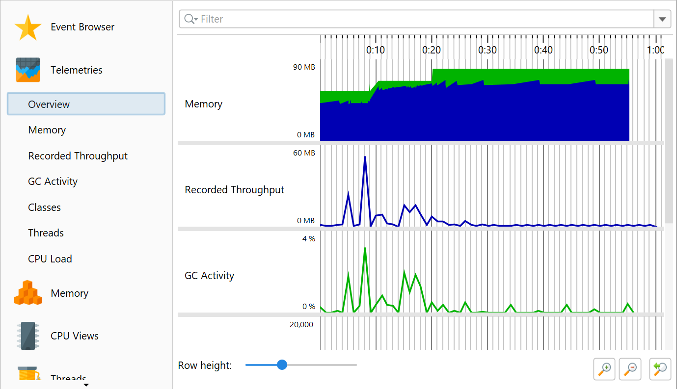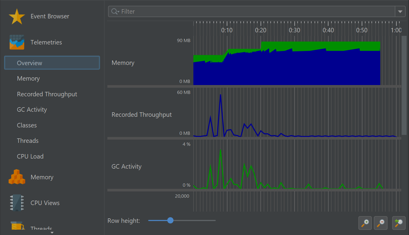 With the exception of the "Recorded objects telemetry", all telemetries in full profiling sessions are also available in JFR snapshots with some limitations in the displayed data. The memory telemetry does not show GC-specific pools, the threads telemetry does not show thread counts by thread state and the recorded throughput telemetry shows sizes instead of object counts and does not show the objects that being freed.