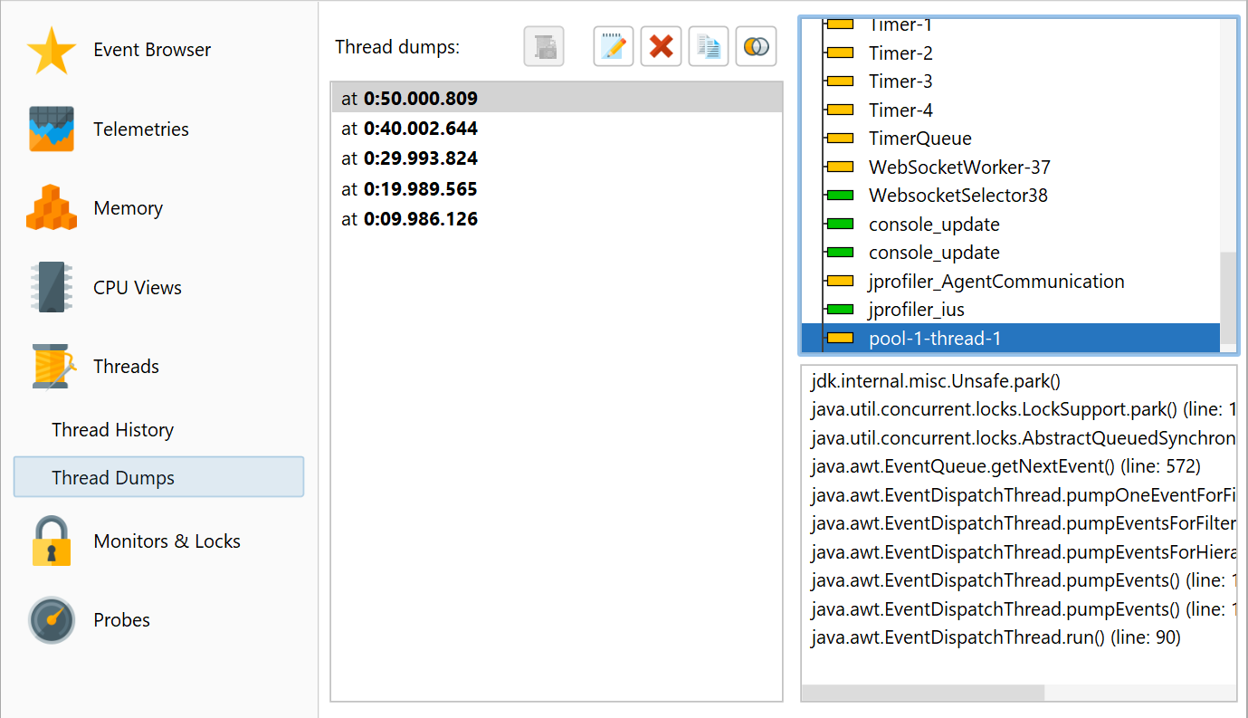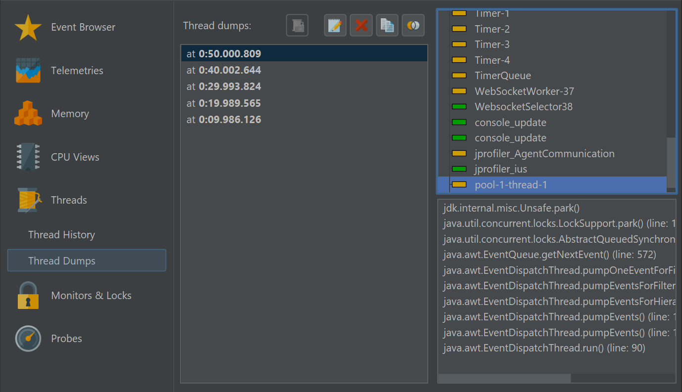 Thread dumps are a feature in both JFR and JProfiler and are shown in the same view. In this case, the event