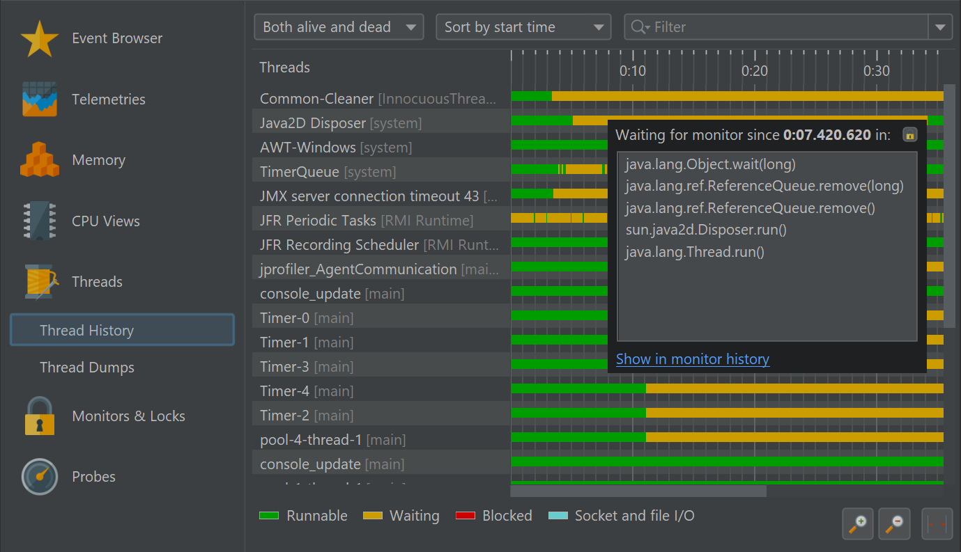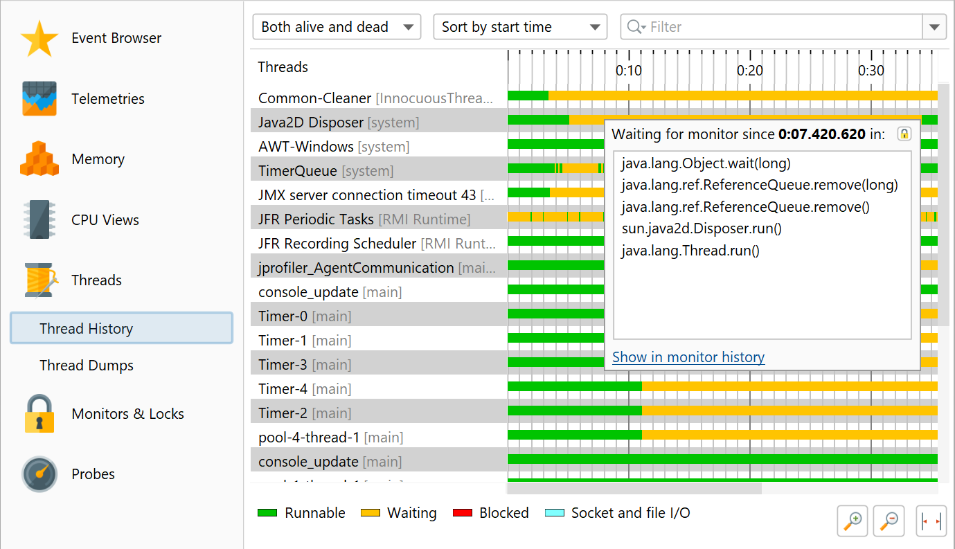 From the chronological method sampling data, the thread history view can be calculated, including the tool tips that show stack traces for waiting and blocking times.