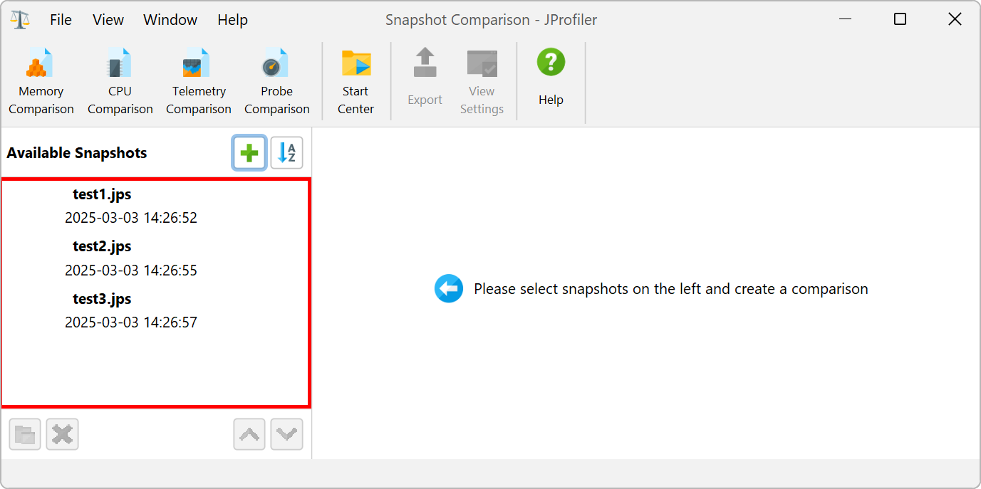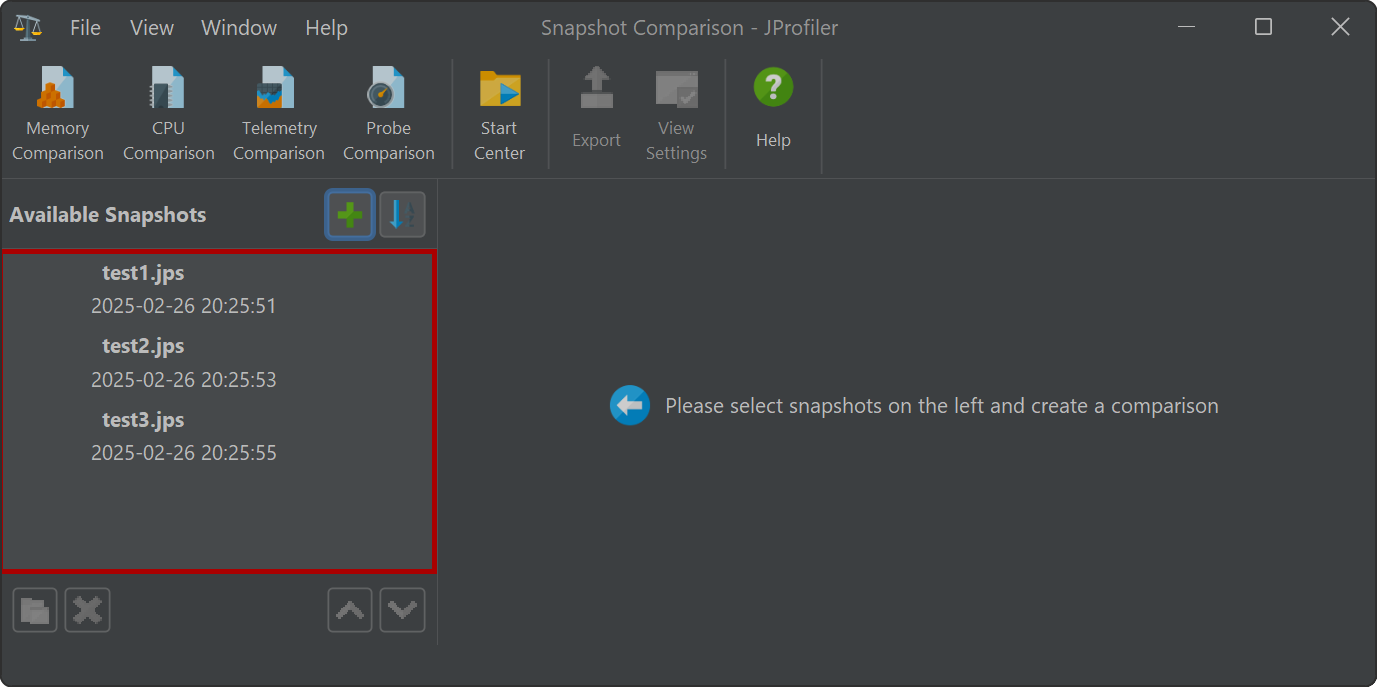 When you use the snapshot comparison feature in JProfiler, the list of snapshots is populated with all the snapshots that you have saved for the current live session. This makes it easy to compare different use cases.