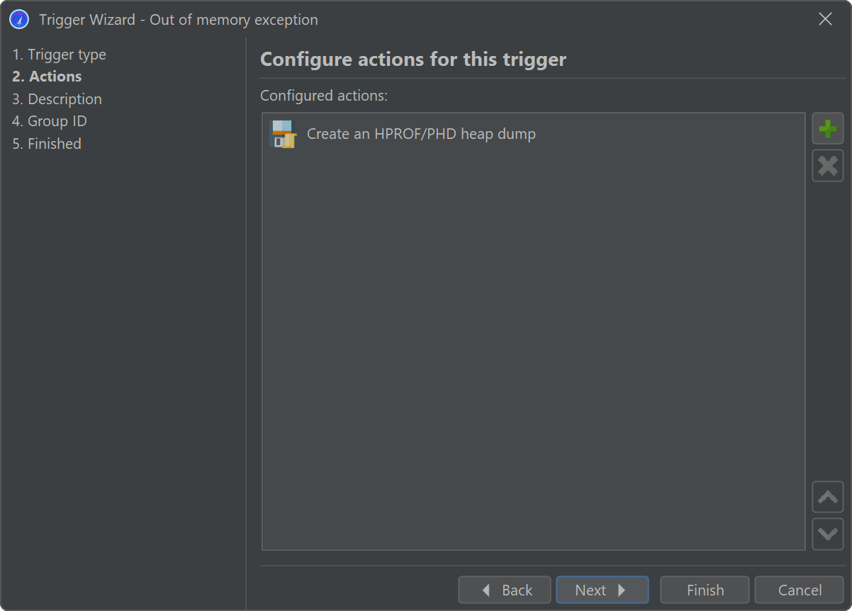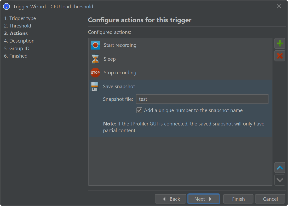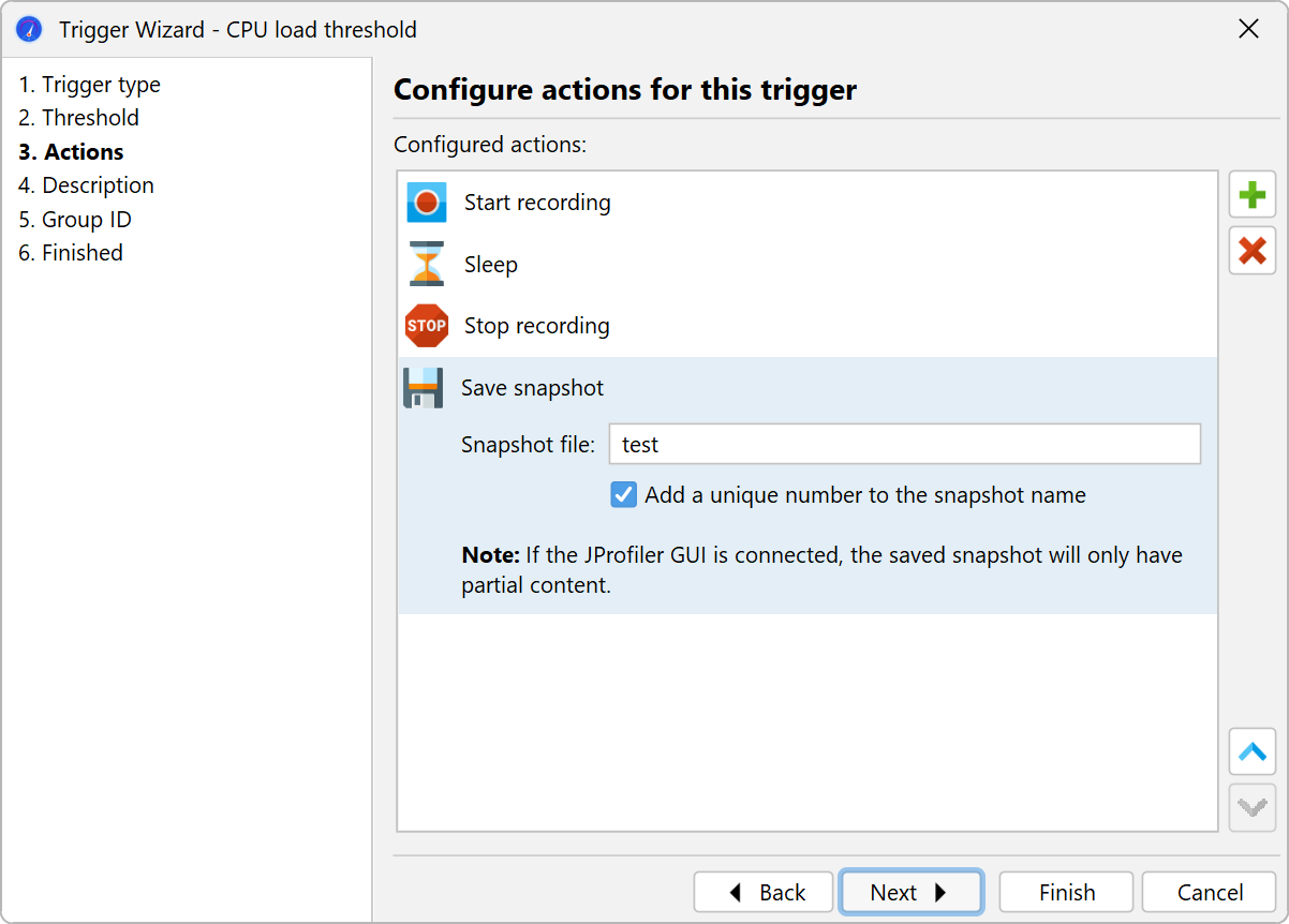 - For exceptional conditions like the "CPU load threshold" trigger or for periodic profiling with a "Timer trigger", save the snapshot after recording some data with a "Sleep" action in between.