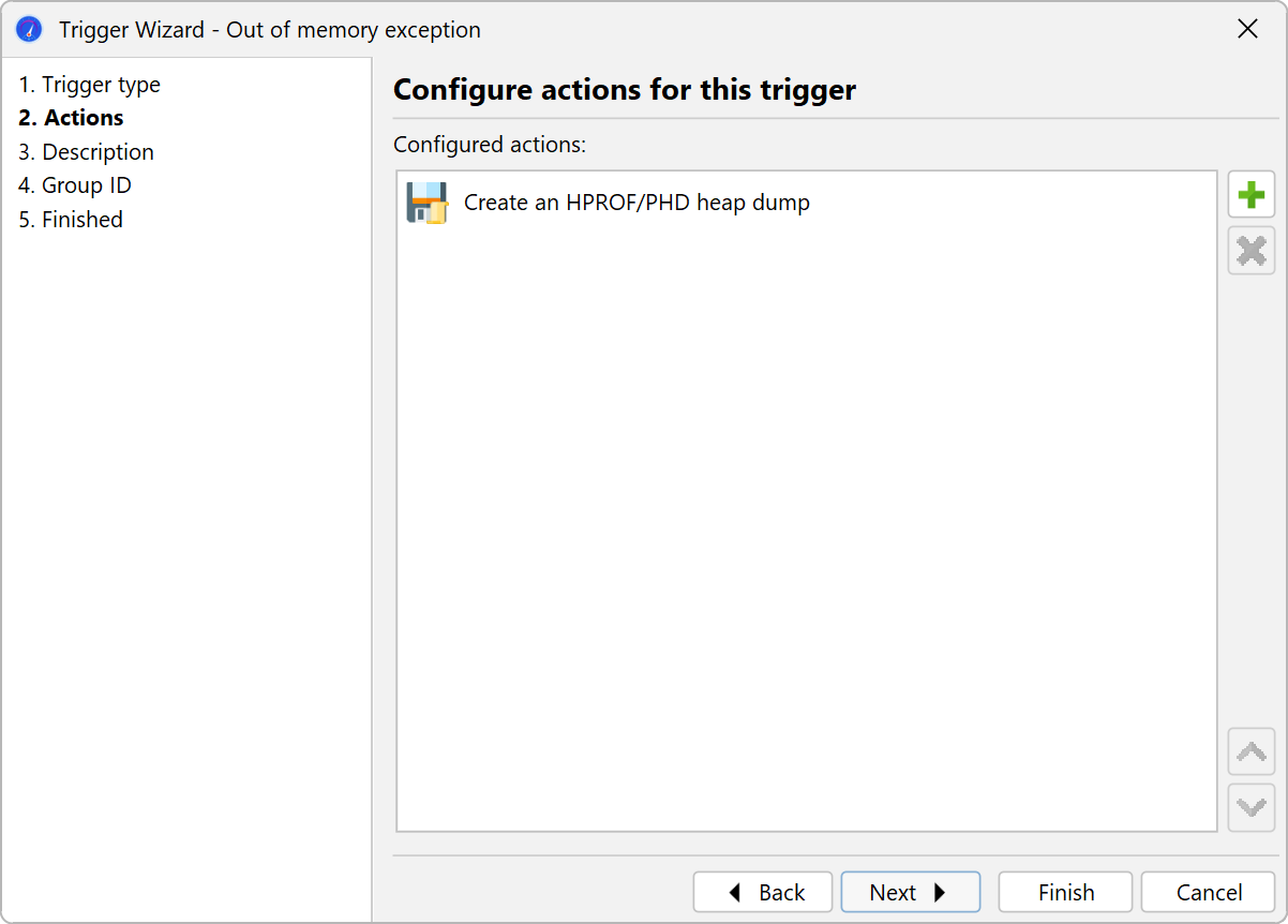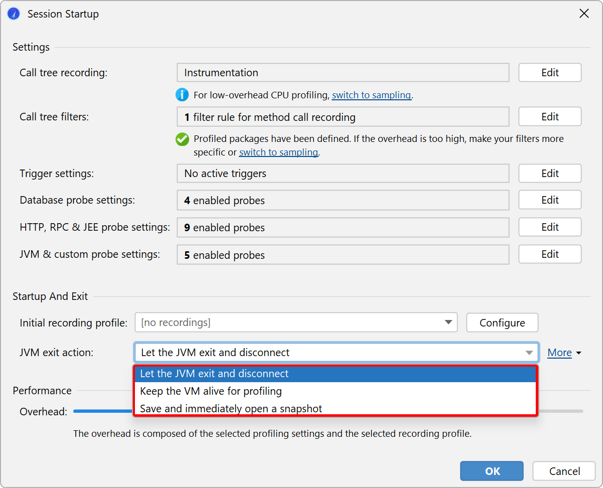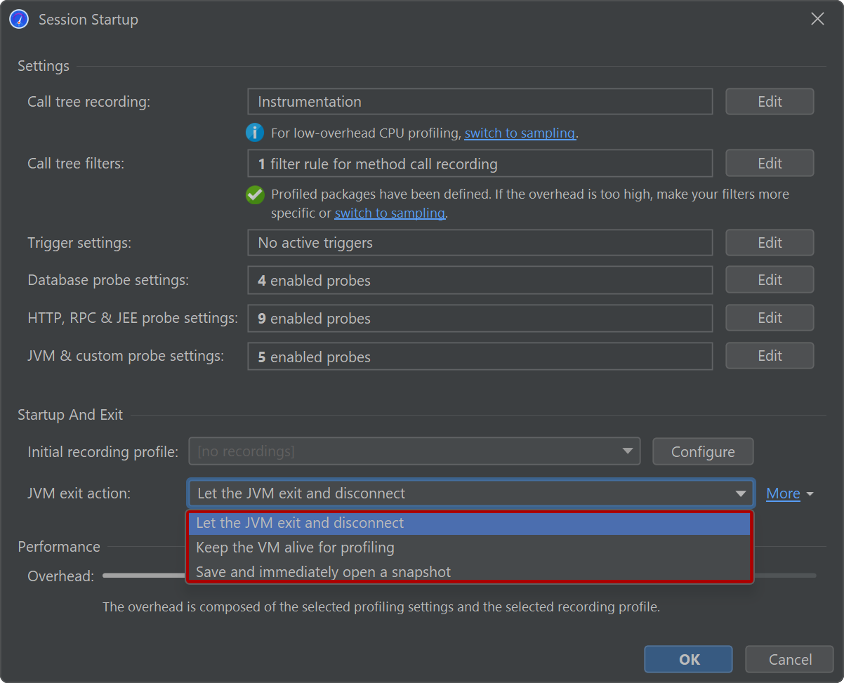 - For test cases, start recording in the "JVM startup" trigger and add a "JVM exit" trigger to save the snapshot when the JVM is terminated.