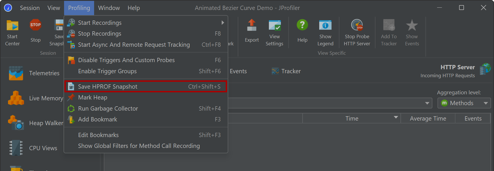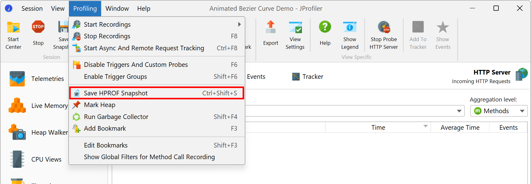 - For live sessions, the JProfiler GUI offers an action in the main menu to trigger an HPROF heap dump.