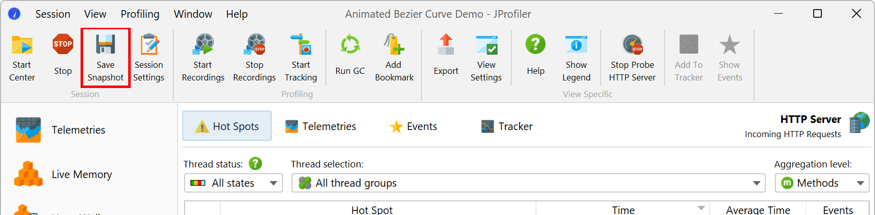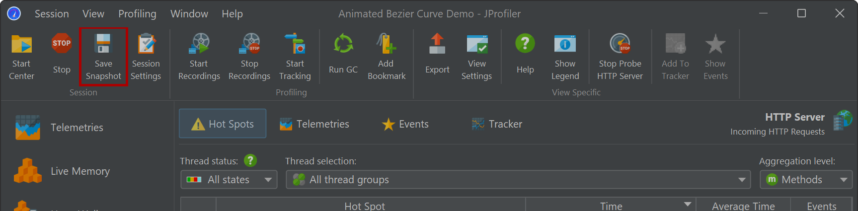 Until now, we have only looked at live sessions where the JProfiler GUI obtains the data from the profiling agent that is running inside the profiled JVM. JProfiler also supports snapshots where all profiling data is written to a file. This can be of advantage in several scenarios: