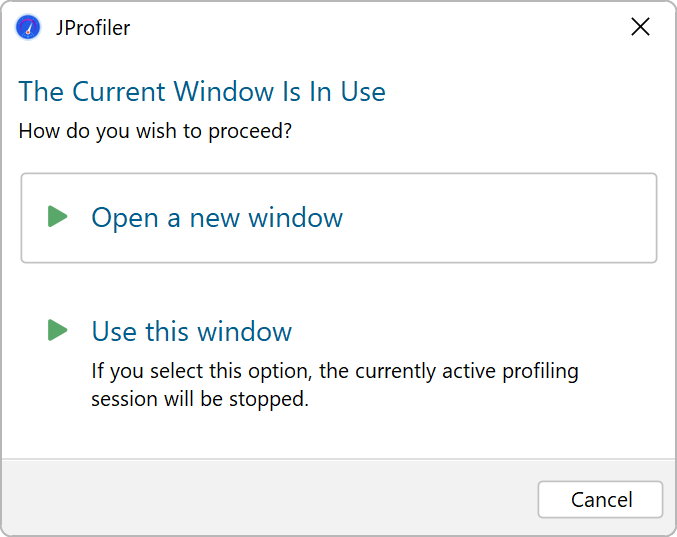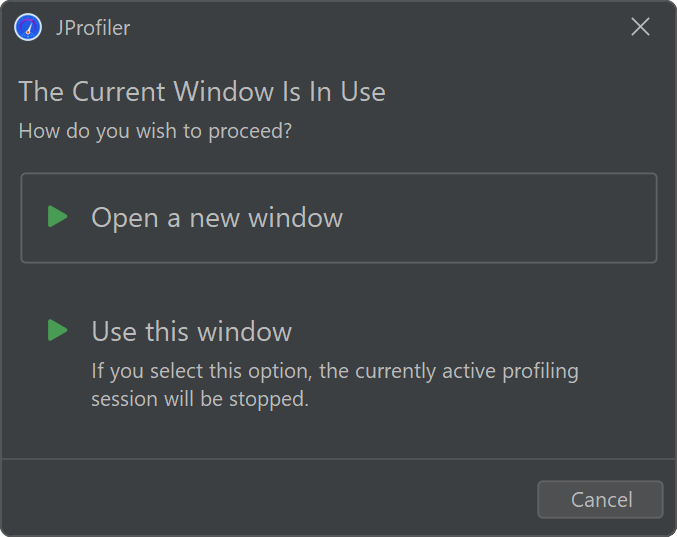 Saved snapshots are added automatically to the File→Recent Snapshots menu, so you can conveniently open a snapshot that you have just saved. When opening a snapshot while the live session is still running, you have a choice of terminating the live session or opening another JProfiler window.