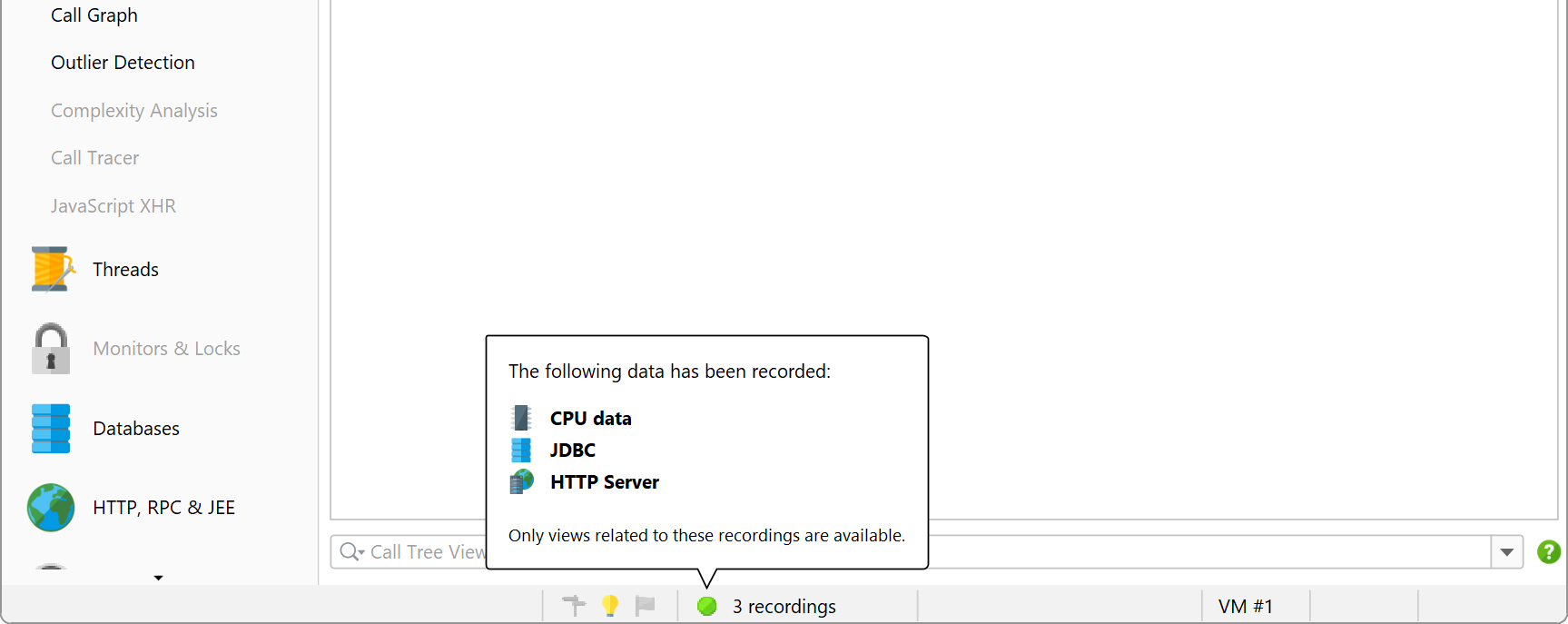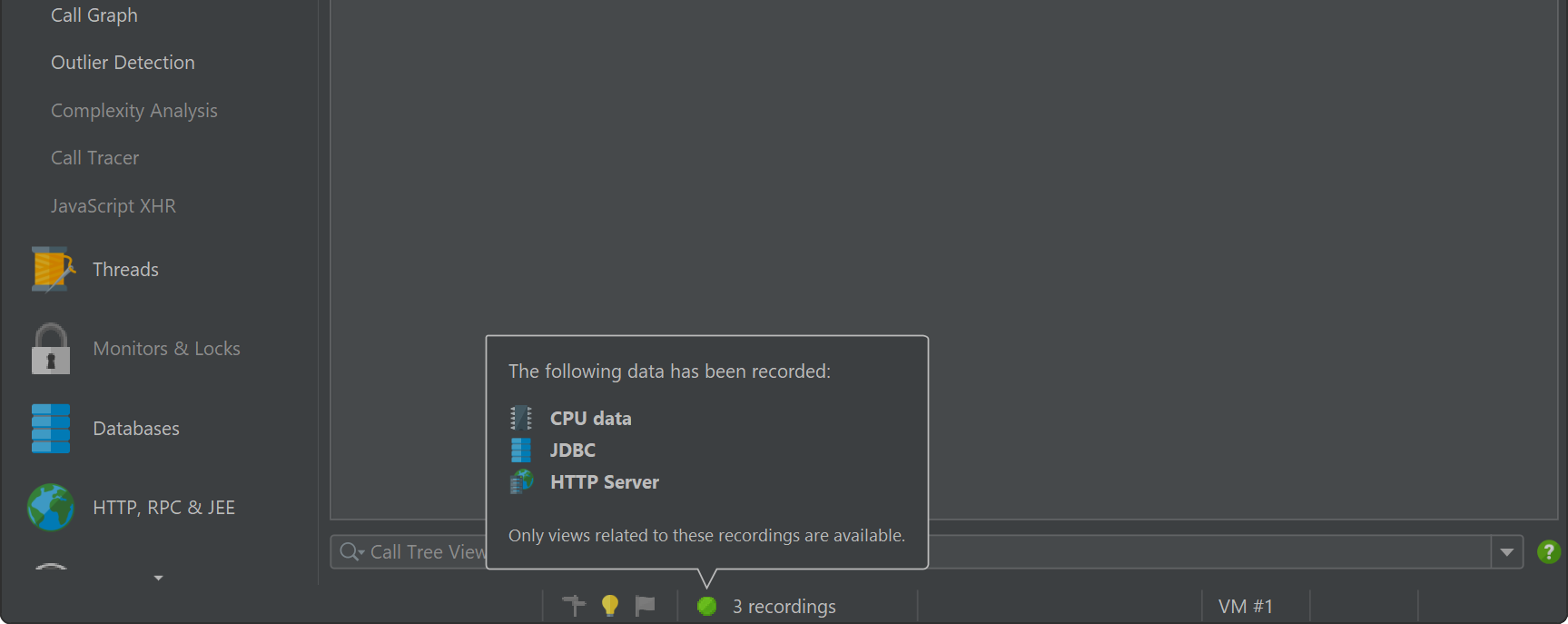 When you open a snapshot, all the recording actions are disabled and only views with recorded data are available. To discover what kind of data has been recorded, hover the mouse over the recording label in the status bar.