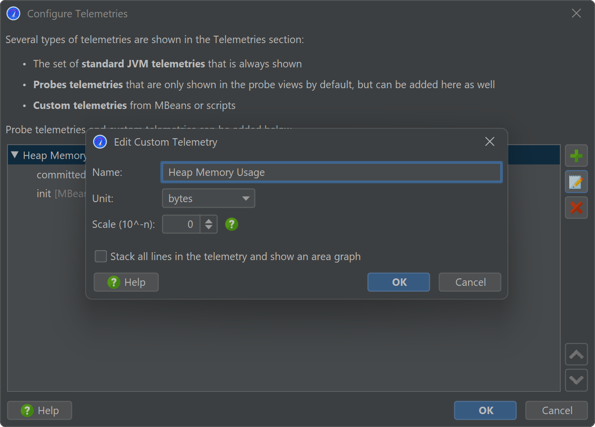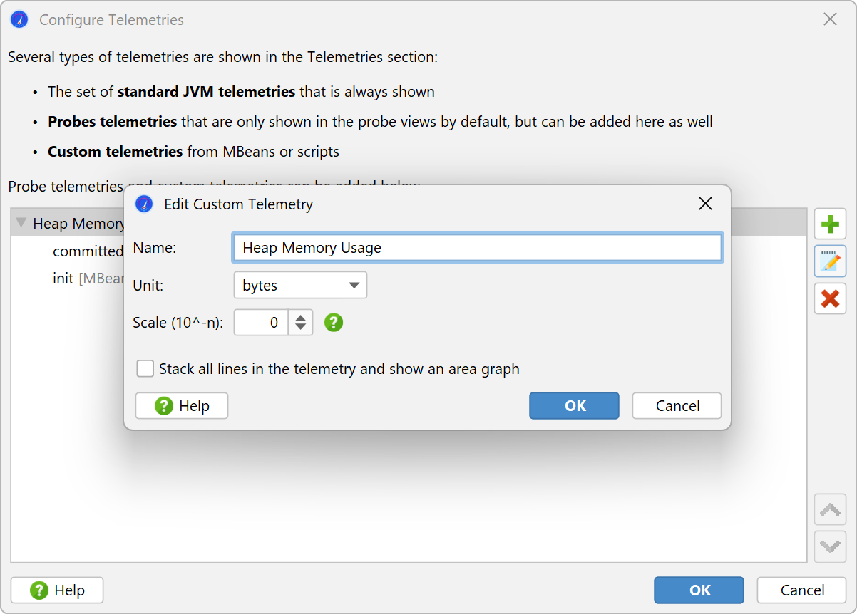In a stacked telemetry, the single telemetry lines are additive and an area graph can be shown. The scale factor is useful to convert a value to a supported unit. For example, if the data source reports kB, the problem is that there is no matching "kB" unit in JProfiler. If you set the scale factor to -3, the values will be converted to bytes and by choosing "bytes" as the unit for the telemetry, JProfiler will automatically display the appropriate aggregate unit in the telemetry.