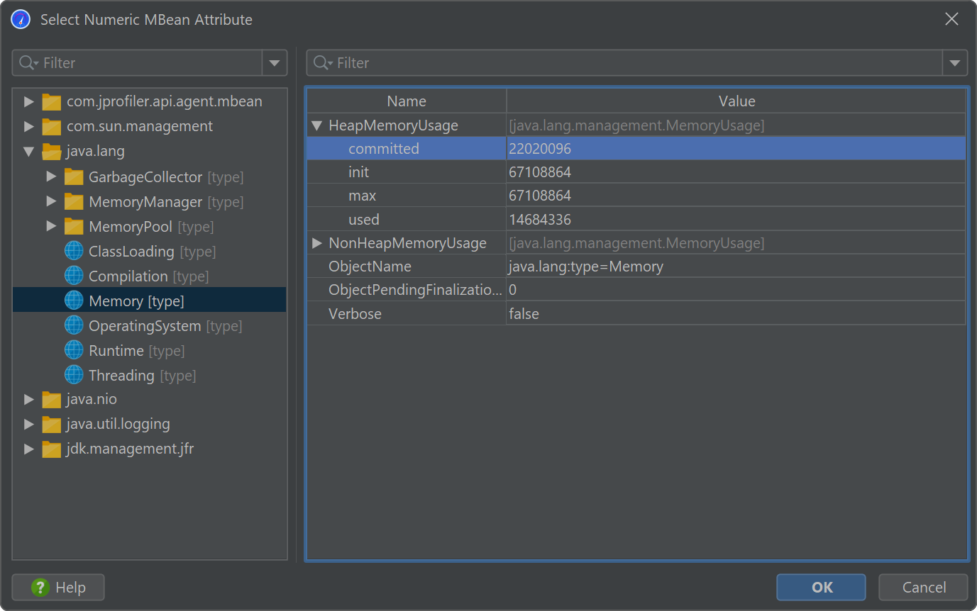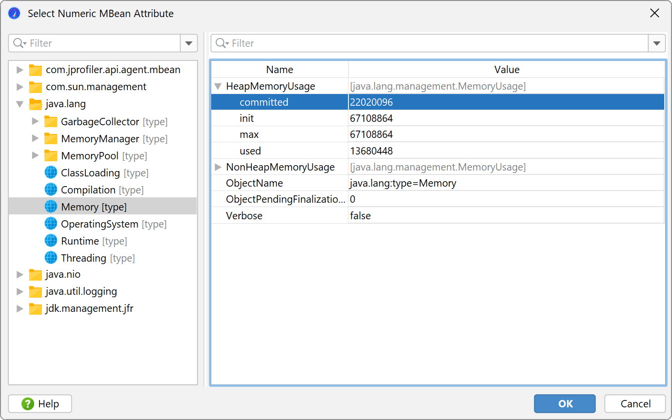The above example shows a call to a platform MBean. Graphing scalar values of MBeans is more conveniently done with an MBean telemetry. Here, an MBean browser allows you to select a suitable attribute. The attribute value must be numeric.