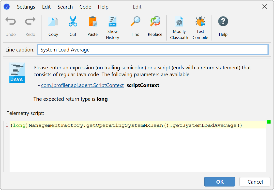 To add a custom telemetry, click on the Configure Telemetries tool bar button that is visible in the "Telemetries" section. In a script telemetry, you have access to all classes that are configured in the classpath of the current JProfiler session. If a value is not available directly, add a static method to your application that you can call in this script.
