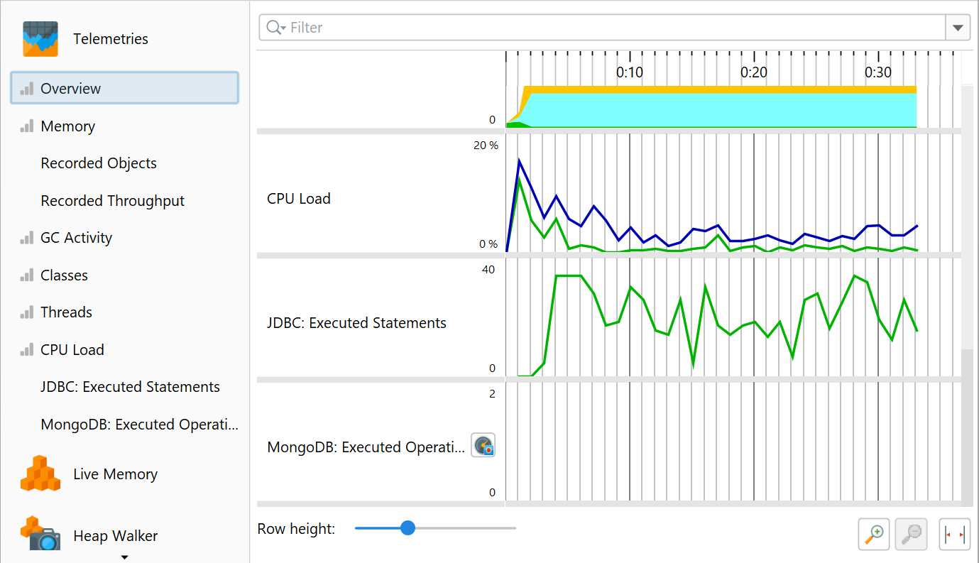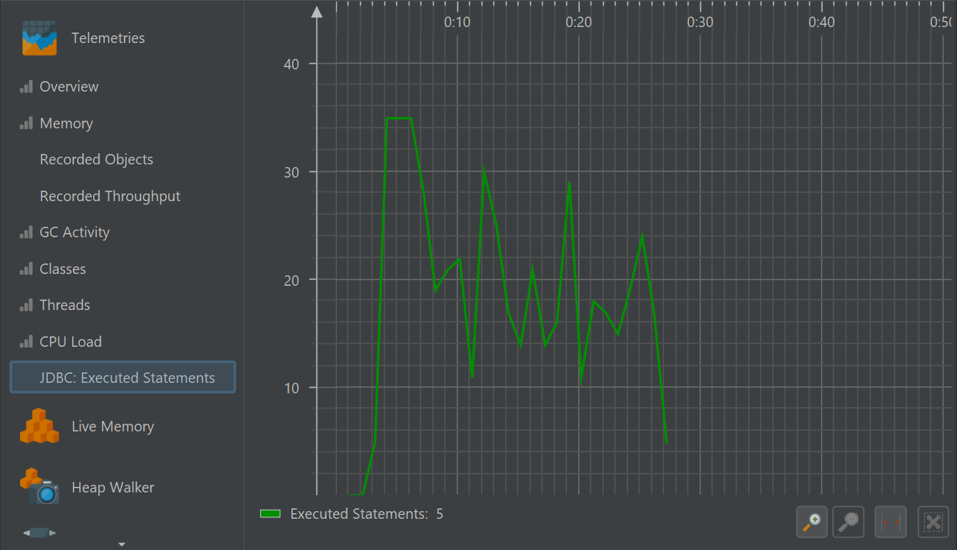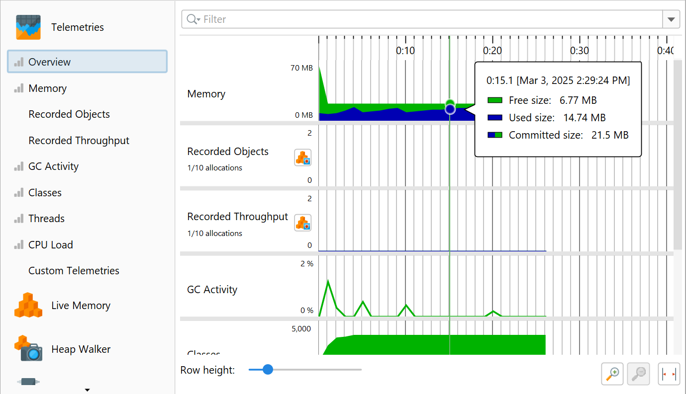 One aspect of profiling is monitoring scalar measurements over time, for example, the used heap size. In JProfiler, such graphs are called telemetries. Observing telemetries gives you a better understanding of the profiled software, allows you to correlate important events over different measurements and may prompt you to perform a deeper analysis with other views in JProfiler if you notice unexpected behavior.