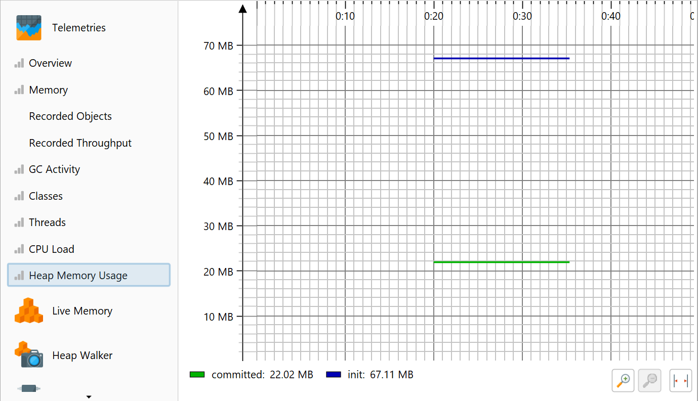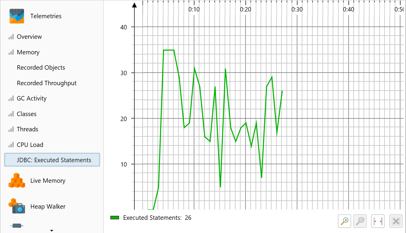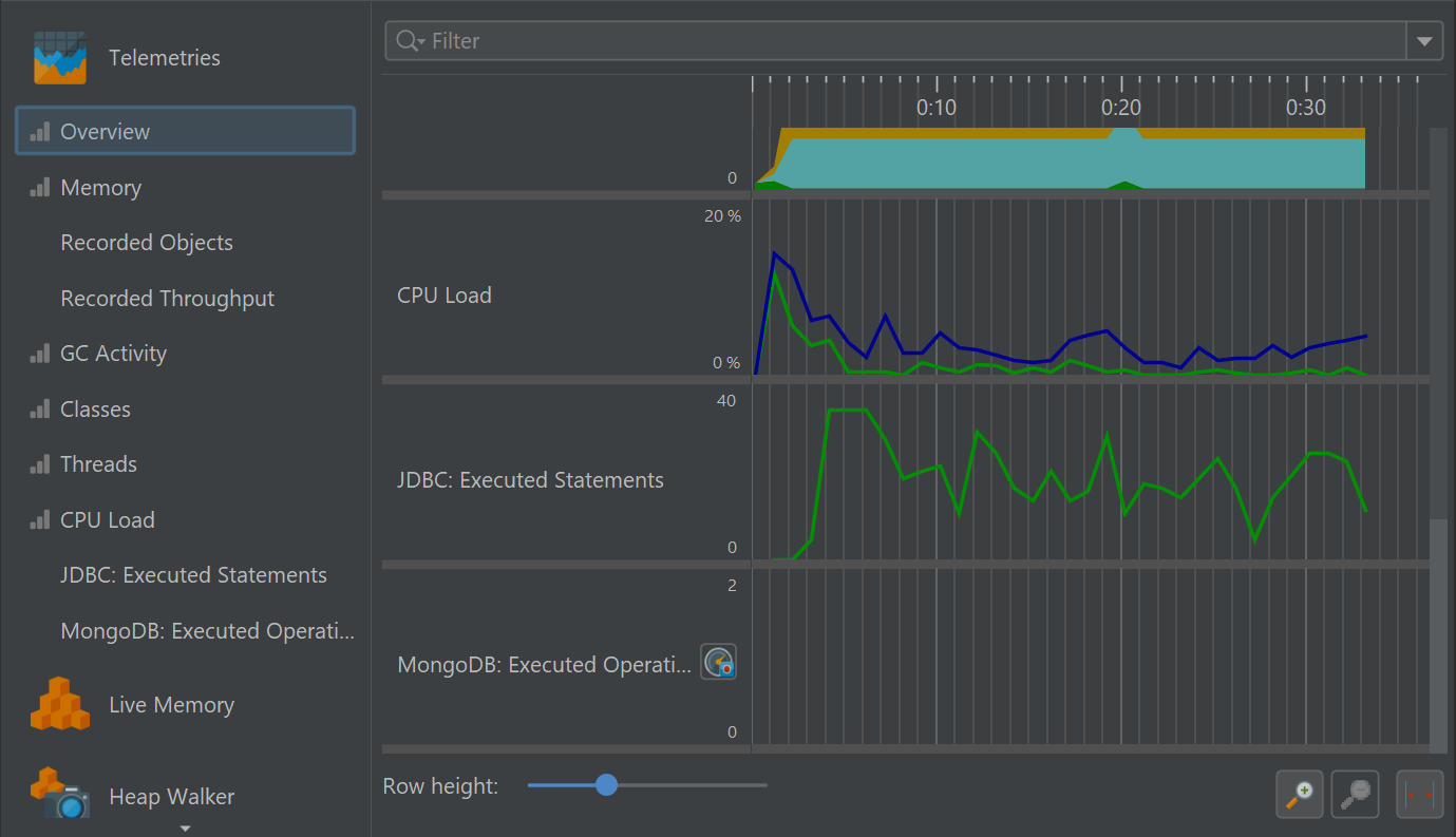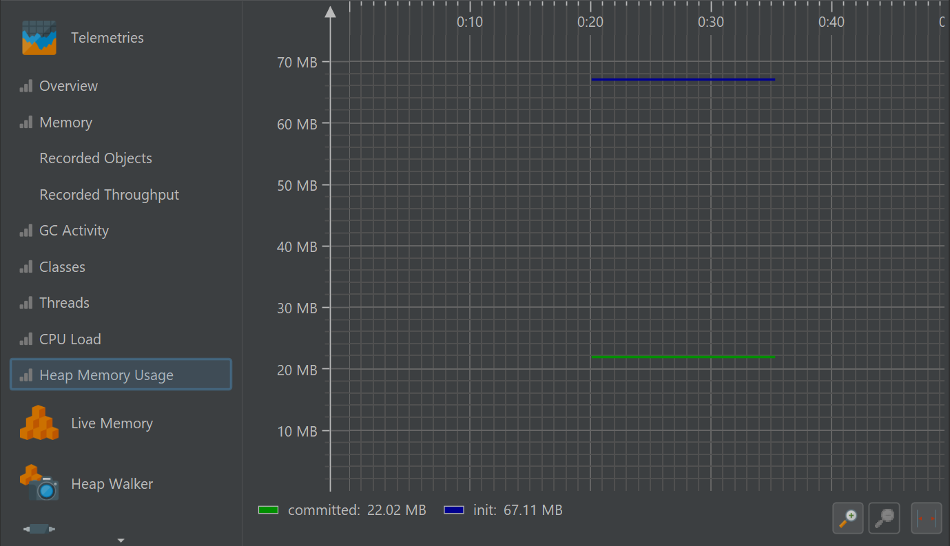 One aspect of profiling is monitoring scalar measurements over time, for example, the used heap size. In JProfiler, such graphs are called telemetries. Observing telemetries gives you a better understanding of the profiled software, allows you to correlate important events over different measurements and may prompt you to perform a deeper analysis with other views in JProfiler if you notice unexpected behavior.