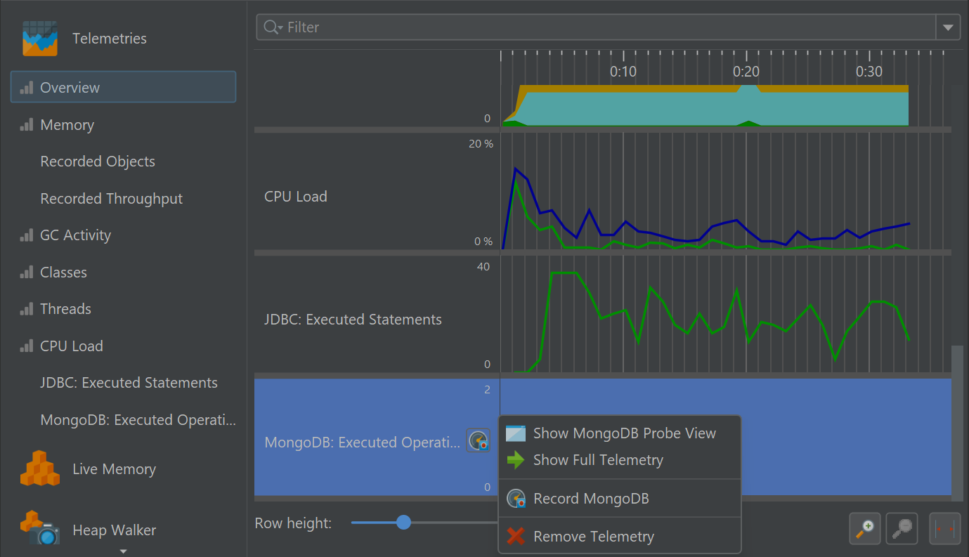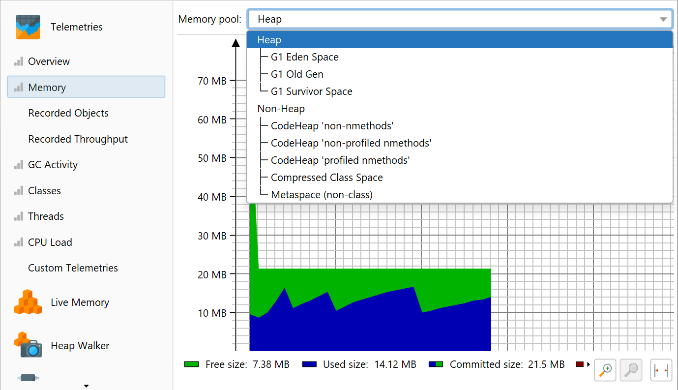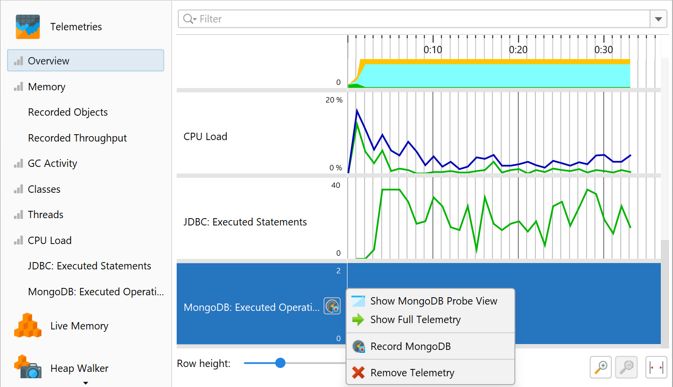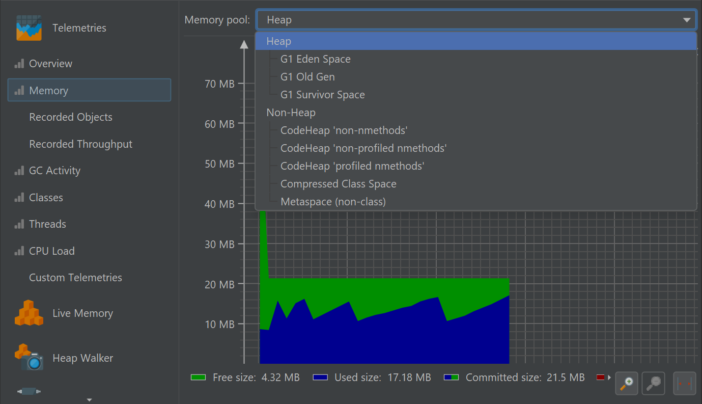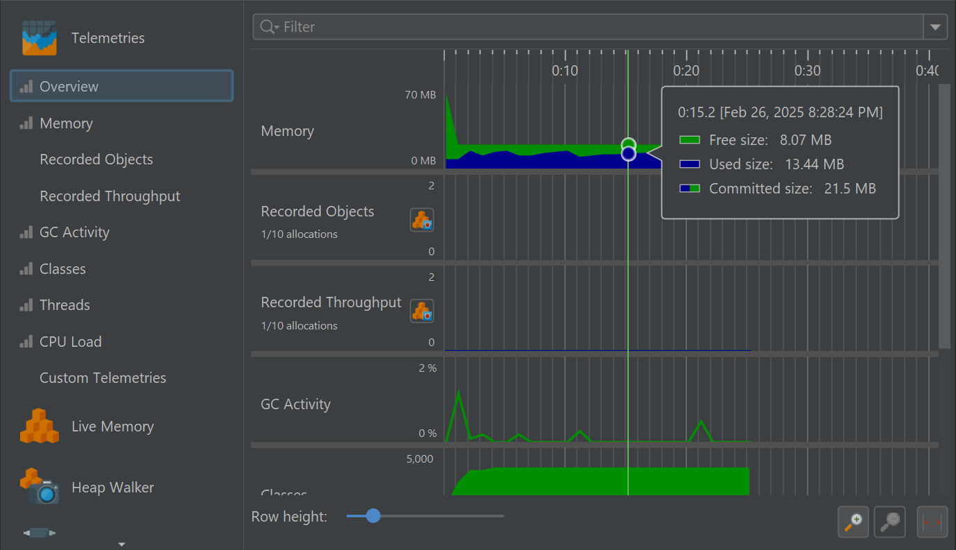 In the "Telemetries" section of the JProfiler UI, a number of telemetries are recorded by default. For interactive sessions, they are always enabled. Some telemetries require that a special type of data is recorded. In that case, a recording action will be shown in the telemetry.