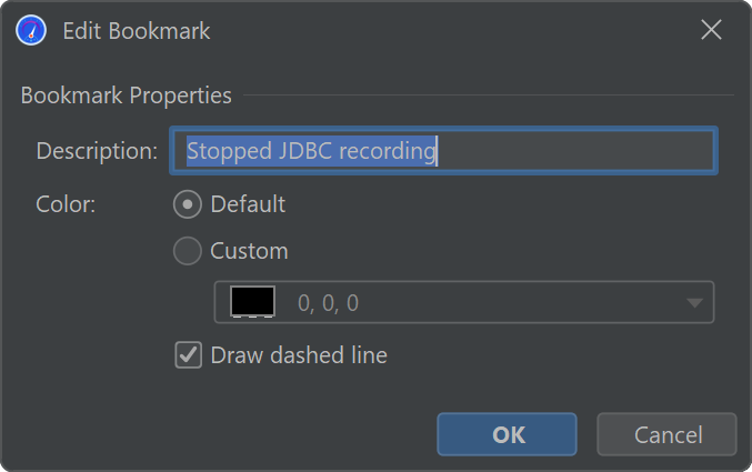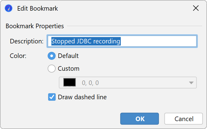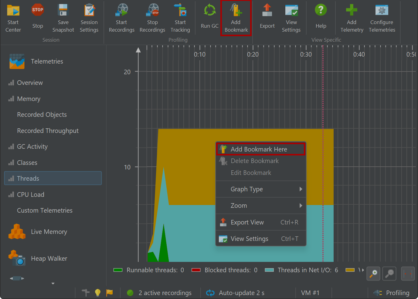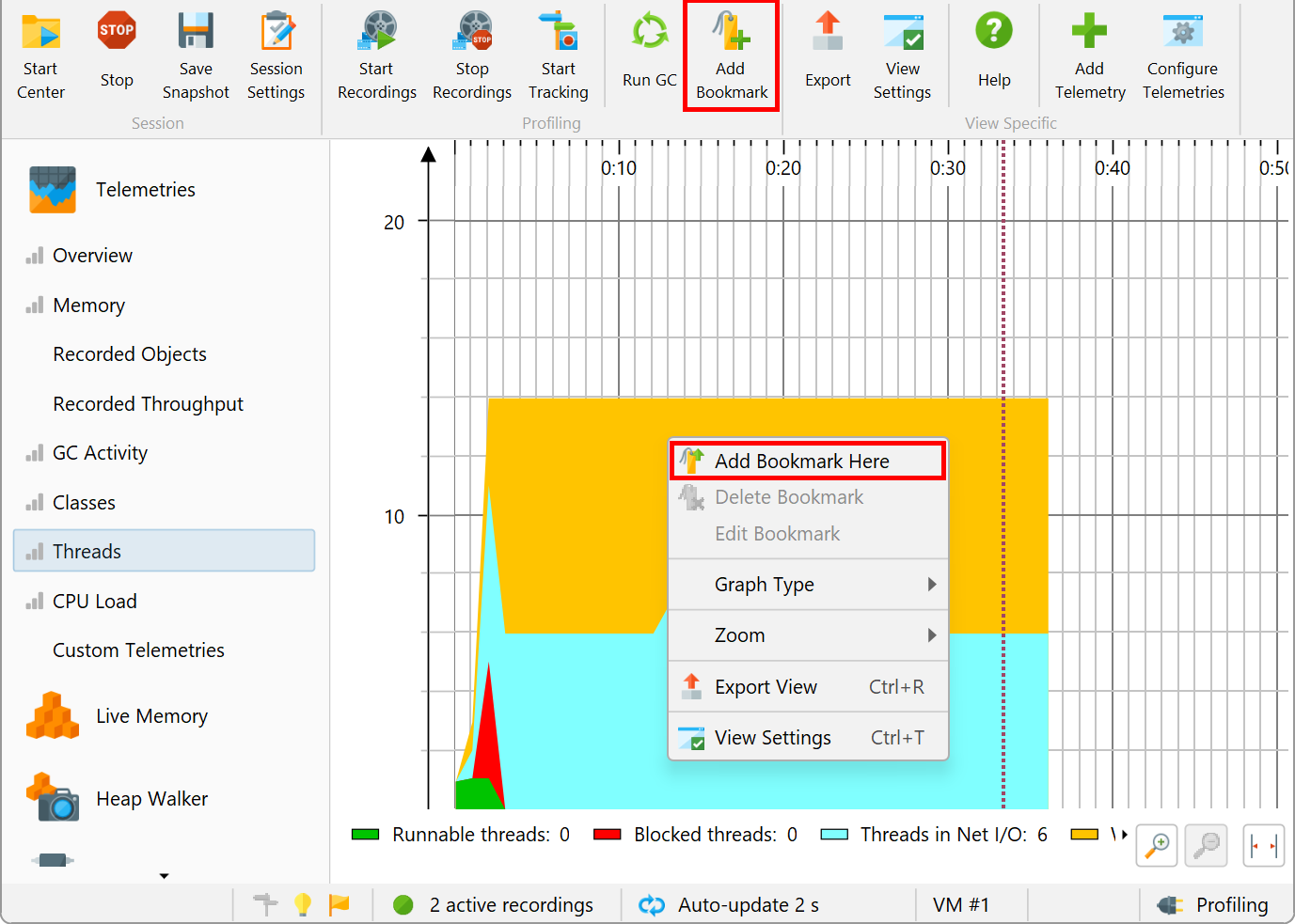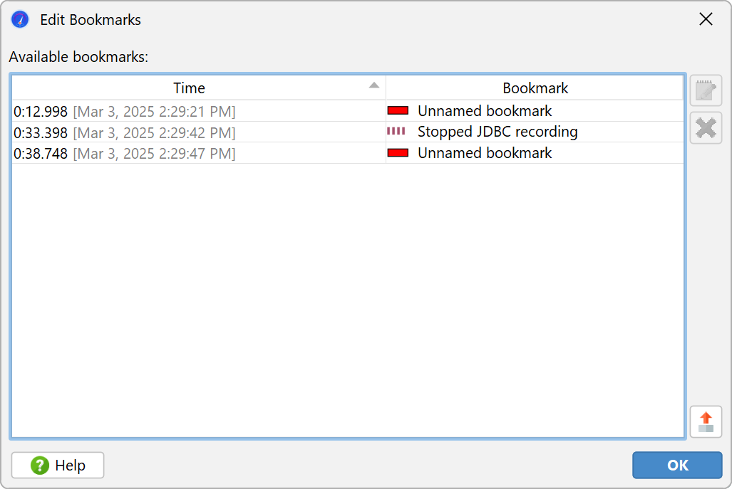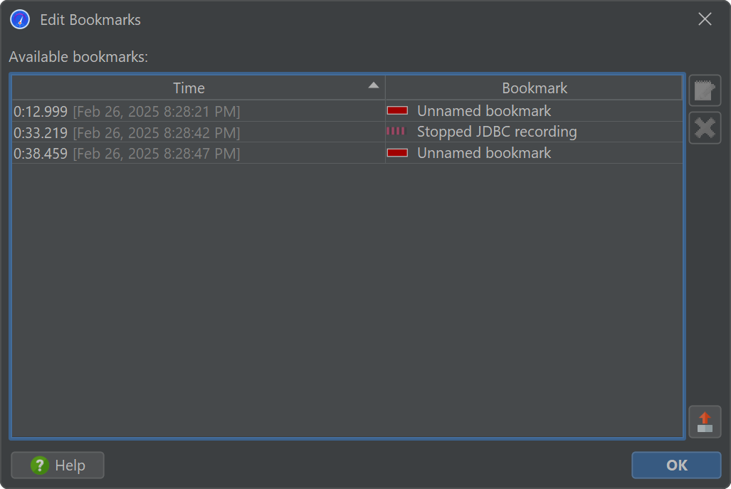 JProfiler maintains a list of bookmarks that are shown in all telemetries. In an interactive session, you can add a bookmark at the current time by clicking on the Add Bookmark tool bar button, or by using the Add Bookmark Here feature in the context menu.