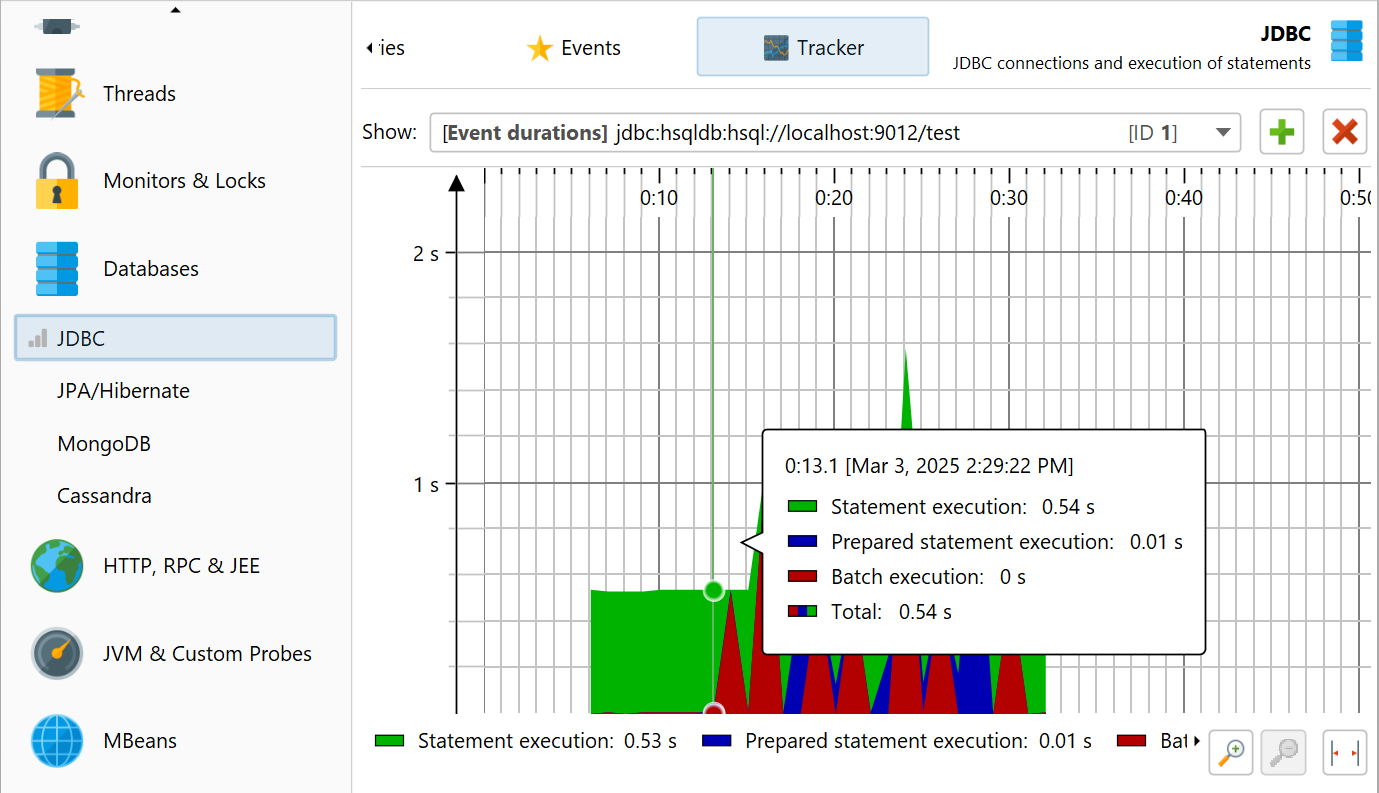 Finally, there are "tracking" telemetries that monitor a scalar value that is selected in another view. For example, the class tracker view allows you to select a class and monitor its instance count over time. Also, each probe has a "Tracker" view where selected hot spots or control objects are monitored.