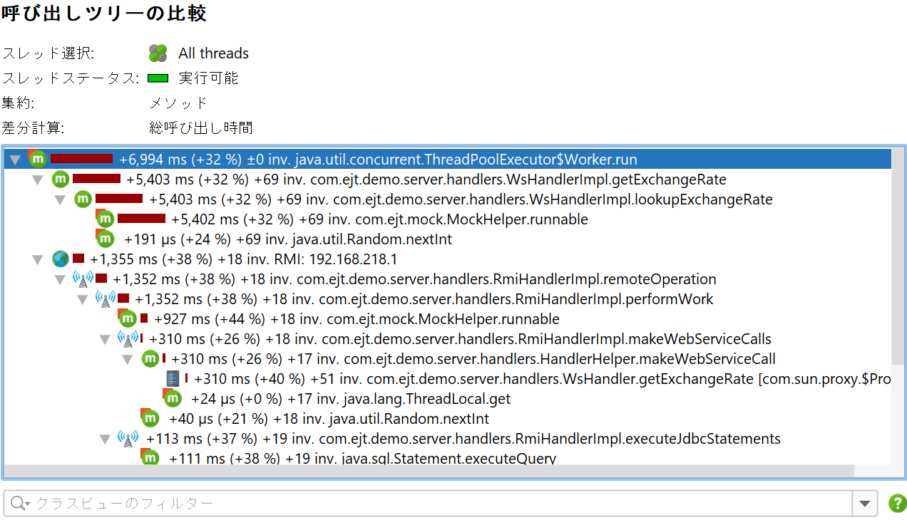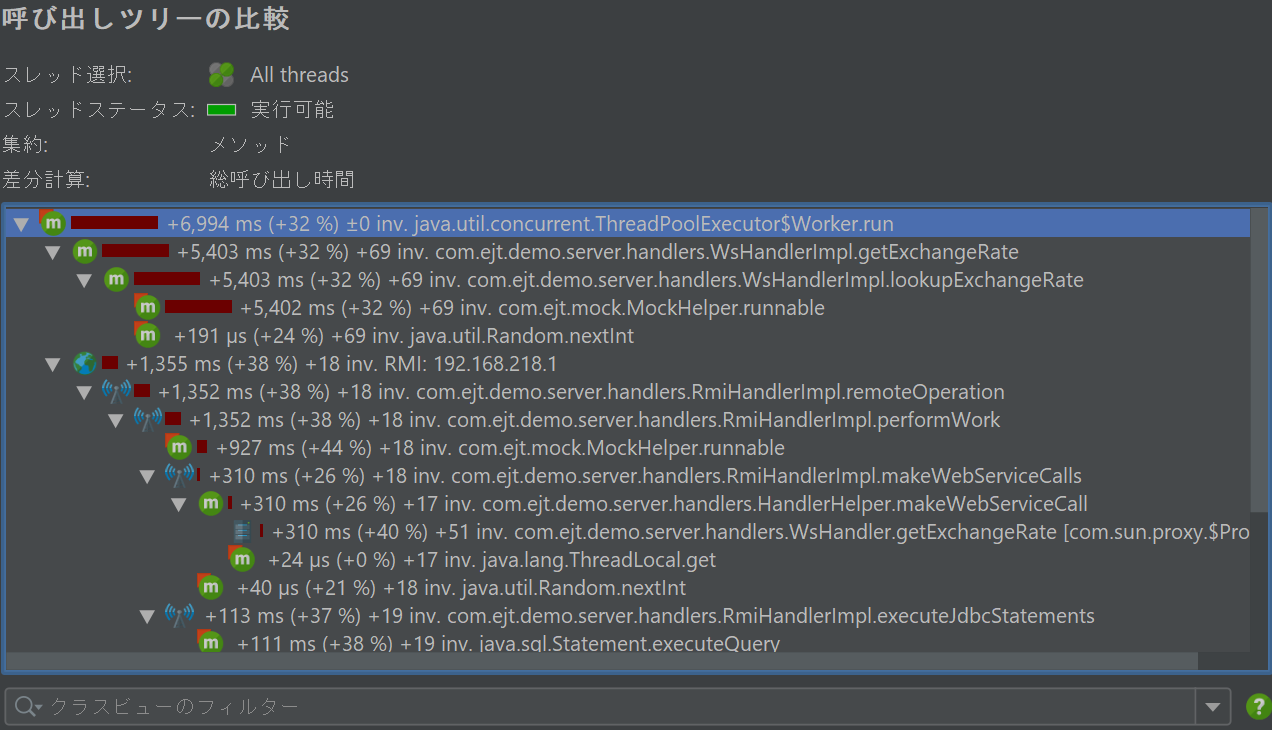 CPU呼び出しツリー、割り当て呼び出しツリー、プローブ呼び出しツリーのそれぞれについて、選択されたスナップショット間の差異を示す別のツリーを計算できます。通常の呼び出しツリービューとは対照的に、インラインバー図は今や変化を表示し、増加は赤、減少は緑で示されます。